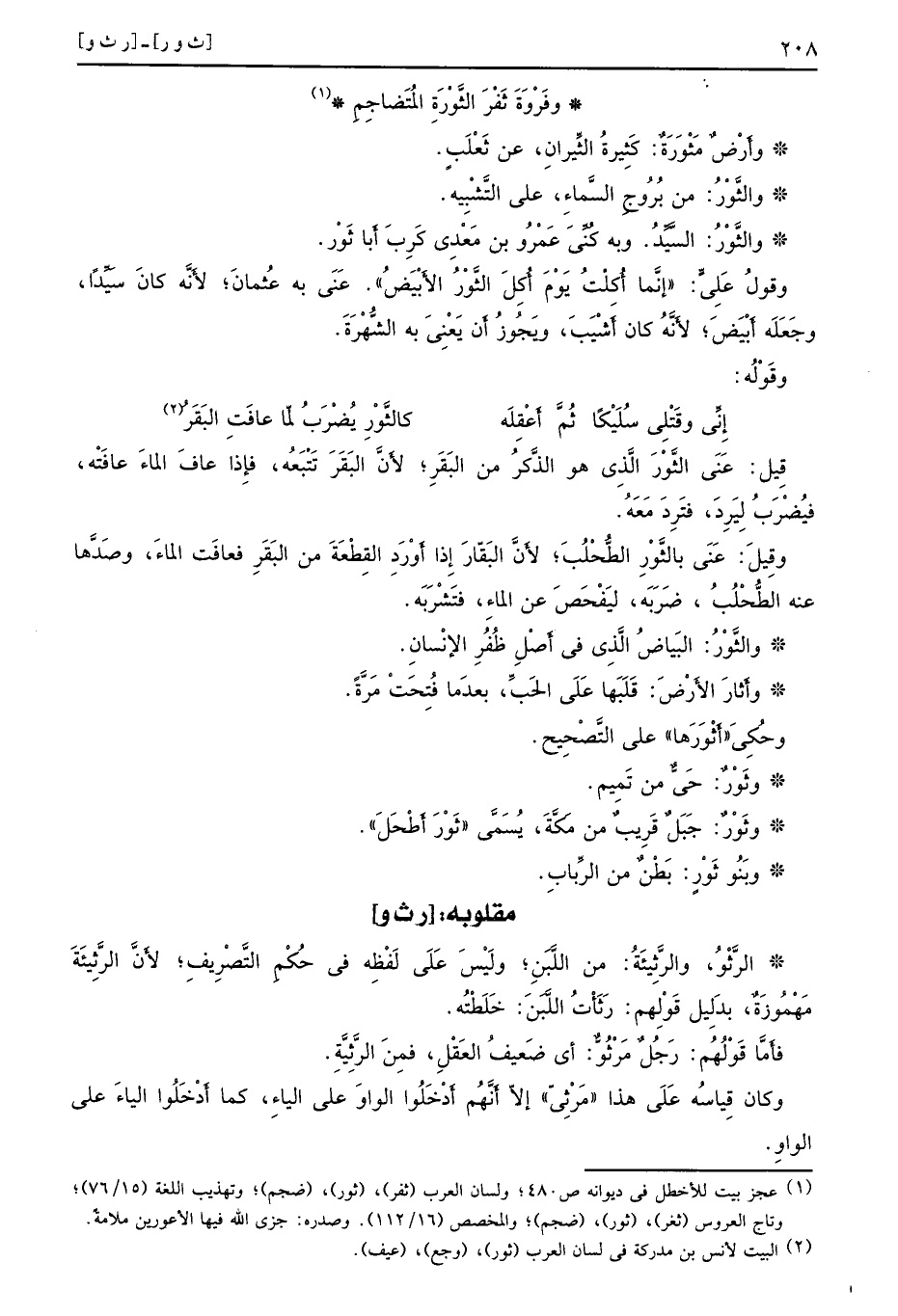 قِيل عَنَى الثَّوْرَ الَّذِي هو الذَّكرُ من البَقَرِ لأَنَّ البَقَرَ تَتْبَعُه فإِذا عافَ الماءَ عافَتْه فيُضْرَبُ لِيَرِدَ فترد مَعَهُ وقِيلَ عَنَى بالثَّوْرِ الطُّحْلُبَ لأَنَّ البَقّارَ إِذا أَوْرَدِ القِطْعَةَ من البَقَرِ فعافَت الماءَ وصَدَّها عنه الطُّحْلُبُ ضَرَبَه ليَفْحَصَ عن الماءِ فتَشْرَبَه والثَّوْرُ البَياضُ الَّذِي في أَصْلِ ظُفُرِ الإنْسانِ وأثارَ الأَرْضَ قَلَبَها عَلَى الحَبِّ بعدَما فُتِحَتْ مَرَّةً وحُكِيَ أَثْوَرَها على التَّصْحِيح وثَوْرٌ حَيٌّ من تَمِيم وثَوْرٌ جَبَلٌ قَرِيبٌ من مَكَّةَ يُسَمَّى ثَوْرَ أَطْحَلَ وبَنُو ثَوْرٍ بَطْنٌ من الرِّبابِ