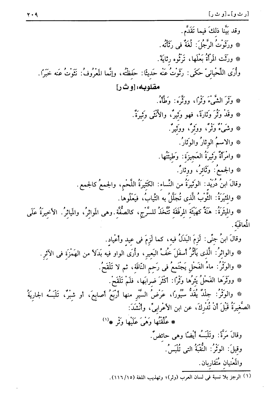 [وث ر] وَثَرَ الشَّيْءَ وَثْرًا ووَثَّرَه وَطَّاَهُ وقَدْ وَثُرَ وَثارَةً فهو وَثِيرٌ والأُنْثَى وَثِيرَةٌ وشَيْءٌ وَثْرٌ ووَثِرٌ ووَثِيرٌ والاسمُ الوِثارُ والوَثارُ وامْرَأَةٌ وَثِيرَةُ العَجِيزَةِ وَطِيئَتُها والجمعُ وَثَائِرُ ووِثارٌ وقالَ ابنُ دُرَيْدٍ الوَثيرَةُ من النِّساءِ الكَثِيرَةُ اللَّحْمِ والجمعُ كالجمع والمِثَيرَةُ الثَّوْبُ الَّذِي تُجَلَّلُ به الثِّيابُ فيَعْلُوها والمِيثَرَةُ هَنَةٌ كهَيْئَةِ المِرْفَقَةِ تُتَّخَذُ للسَّرْجِ كالصُّفَّةِ وهي المَواثِرُ والمَياثِرُ الأَخِيرَةُ عَلَى المُعاقَبَةِ وقالَ ابنُ جِنِّي لَزِمَ البَدَلُ فيهِ كما لَزِمَ في عِيدٍ وأَعْيادٍ والواثِرُ الَّذِي يَأْثُرُ أَسفَلَ خُفِّ البَعِيرِ وأُرَى الواو فيه بَدلاً من الهَمْزَةِ في الآثِرِ والوَثْرُ ماءُ الفَحْلِ يَجْتَمِعُ في رَحِمِ النّاقَةِ ثم لا تَلْقَحُ ووَثَرَها الفَحْلُ يَثِرُها وَثْرًا أَكْثَرَ ضِرابَها فلَمْ تَلْقَحْ والوَثْرُ جِلْدٌ يُقَدُّ سُيُورًا عَرْضُ السَّيْرِ منها أَرْبَعُ أَصابِعَ أو شِبْرٌ تَلْبِسَهُ الجارِيَةُ الصَّغِيرَةُ قَبْلَ أَنْ تُدْرِكَ عن ابن الأَعْرابِيِّ وأَنْشَدَ