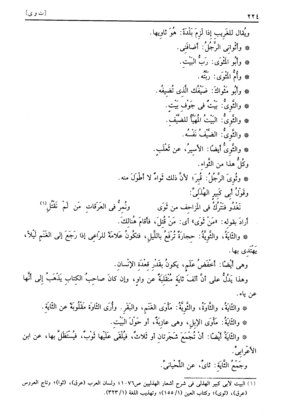 ويُقال للغَرِيبِ إِذا لَزِمَ بَلْدَةً هُوَ ثاوِيها وأَثْوانِي الرَّجُلُ أَضافَنِي وأَبُو المَثْوَى رَبُّ البَيْتِ وأُمُّ المَثْوَى رَبَّتُه وأَبُو مَثْواكَ ضَيْفُك الَّذِي تُضيفُه والثَّوِيُّ بَيْتٌ في جَوْفِ بَيْتٍ والثَّوِيُّ البَيْتُ المُهَيَّأُ للضَّيْفِ والثَّوِيُّ الضَّيْفُ نَفْسُه والثَّوِيُّ أَيضًا الأَسِيرُ عن ثَعْلَبٍ وكُلُّ هذا من الثَّواءِ وثُوِيَ الرَّجُلُ قُبِرَ لأَنَّ ذلك ثَواءٌ لا أَطْوَلَ منه وقَوْلُ أَبِي كَبِيرٍ الهُذَلِيِّ
