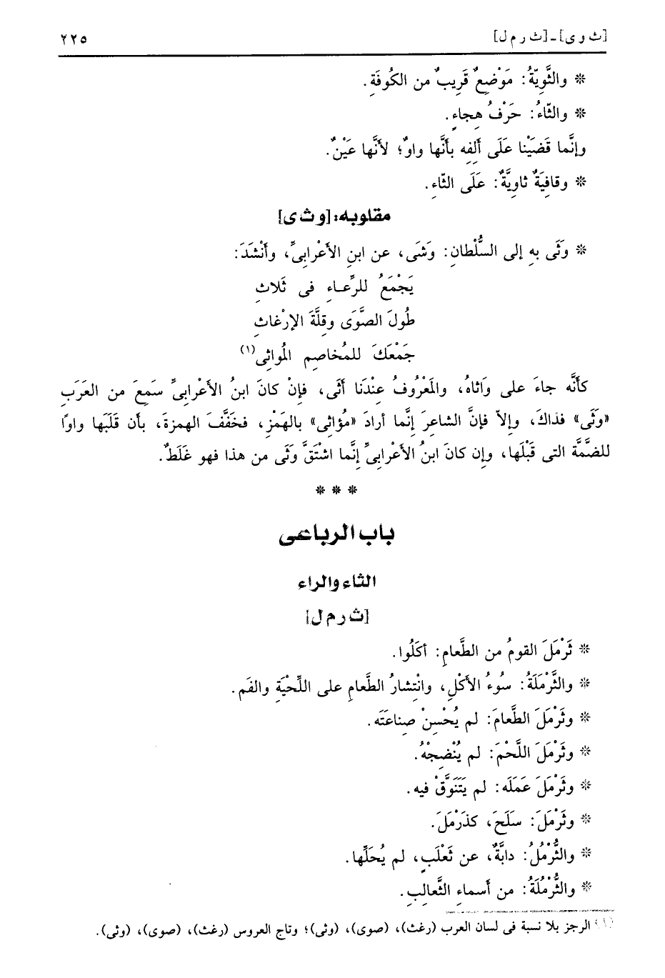 [ث ر م ل] ثَرْمَلَ القومُ من الطَّعامِ أَكَلُوا والثَّرْمَلَةُ سُوءُ الأَكْلِ وانْتِشارُ الطَّعامِ على اللِّحْيَةِ والفَم وثَرْمَلَ الطَّعامَ لم يُحْسِنْ صِناعَتَه وثَرْمَلَ اللَّحْمَ لم يُنْضِجْهُ وثَرْمَلَ عَمَلَه لم يَتَنَوَّقْ فيه وثَرْمَلَ سَلَحَ كذَرْمَلَ والثُّرْمُلُ دابَّةٌ عن ثَعْلَبٍ لم يُحَلِّها والثُّرْمُلَةُ من أَسماءِ الثَّعالِبِ
