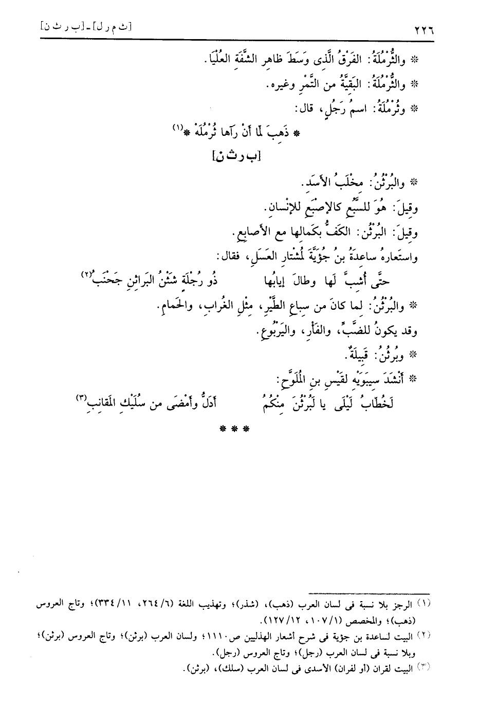 [ب ر ث ن] والبُرْثُنُ مِخْلَبُ الأَسَدِ وقِيلَ هُوَ للسَّبْعِ كالإصْبَعِ للإنْسانِ وقِيلَ البُرْثن الكَفُّ بكَمالِها مع الأَصابِعِ واستَعارهُ ساعِدَةُ بنُ جُؤَيَّةَ لمُشْتارِ العَسَلِ فقال