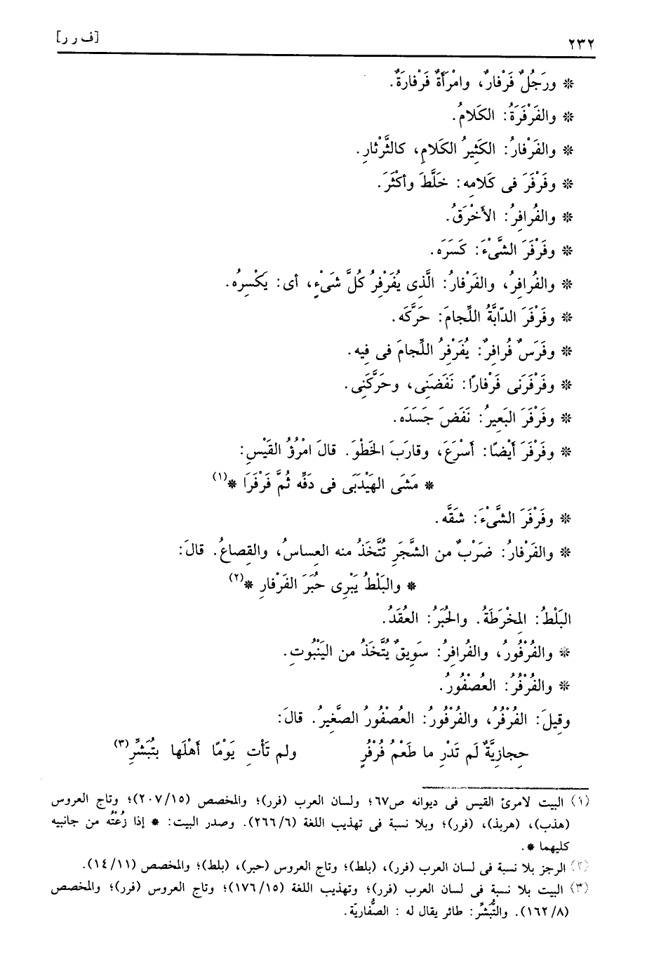 ورَجُلٌ فَرْفارٌ وامْرَأَةٌ فَرْفارَةٌ والفَرْفَرَةُ الكَلامُ والفَرْفارُ الكَثِيرُ الكَلامِ كالثَّرْثارِ وفَرْفَرَ في كَلامِه خَلَّطَ وأكْثَرَ والفُرافِرُ الأَخْرَقُ وفَرْفَرَ الشَّيْءَ كَسَرَه والفُرافِرُ والفَرْفارُ الَّذِي يُفَرْفِرُ كُلِّ شَيْءٍ أي يَكْسِرُه وفَرْفَرَ الدَّابَّةُ اللِّجامَ حَرَّكَه وفَرَسٌ فُرافِرٌ يُفَرْفِرُ اللِّجامَ في فِيه وفَرْفَرَني فَرْفَارًا نَفَضَنِي وحَرَّكَنِي وفَرْفَرَ البَعِيرُ نَفَضَ جَسَدَه وفَرْفَرَ أَيْضًا أَسْرَعَ وقارَبَ الخَطْوَ قالَ امْرُؤُ القَيْسِ