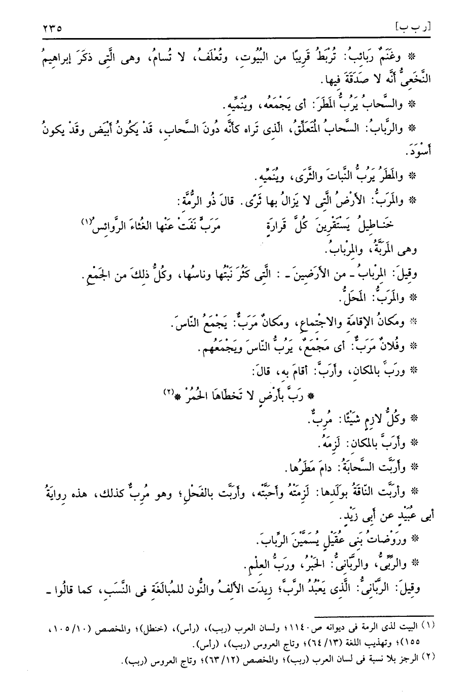 وكُلُّ لازِمٍ شَيْئًا مُرِبٌّ وأَرَبَّ بالمكانِ لَزِمَهُ وأَرَبَّت السًّحابَةُ دامَ مَطَرُها وأرَبَّت النّاقَةُ بوَلَدِها لَزِمَتْهُ وأَحَبَّتْه وأَرَبَّت بالفَحْلِ وهو مُرِبٌّ كذلك هذه رِوايَةُ أَبي عُبَيْدٍ عن أَبِي زَيْدٍ ورَوْضاتُ بَنِي عُقَيْلٍ يُسَمَّيْنَ الرِّبابَ والرِّبِّيُّ والرَّبّانِيُّ الحَبْرُ ورَبُّ العِلْمِ وقِيلَ الرَّبّانِيُّ الَّذِي يَعْبُدُ الرَّبًّ زِيدَت الأَلِفُ والنُّون للمُبالَغَةِ في النَّسَبِ كما قالُوا