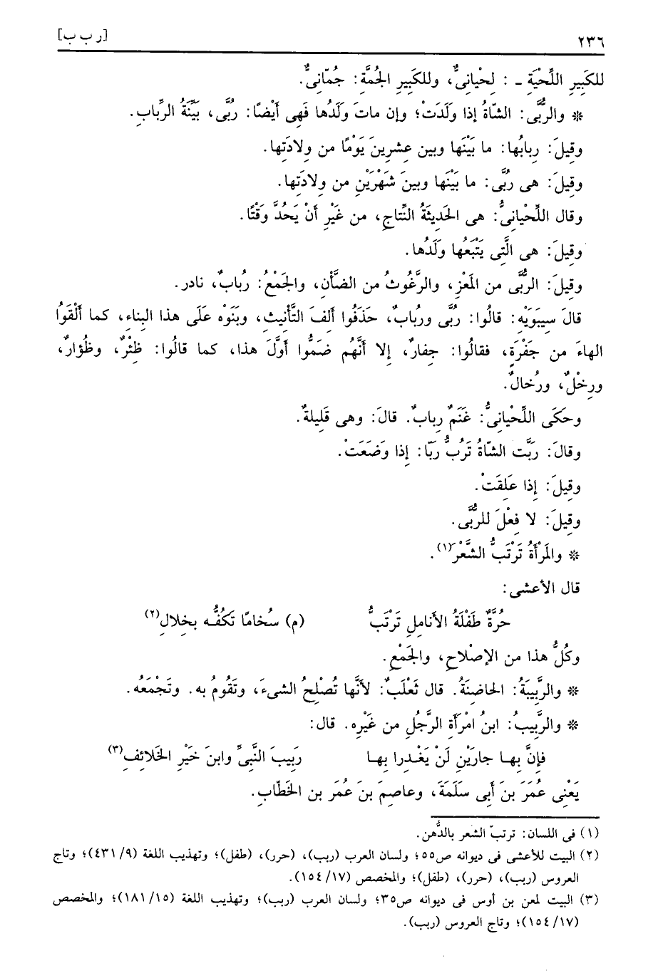 للكَبِيرِ اللَّحْيَةِ لِحْيانِيٌّ وللكَبِيرِ الجُمَّةِ جُمّانِيُّ والرُّبَّى الشّاةُ إذا وَلَدَتْ وإن ماتَ وَلَدُها فَهِي أَيْضًا رُبَّى بَيَّنَةُ الرِّبابِ وقِيلَ رِبابُها ما بَيْنَها وبين عِشرِينَ يَوْمًا من وِلادَتَها وقِيلَ هي رُبَّى ما بَيْنَها وبينَ شَهْرَيْنِ من وِلادَتِها وقال اللِّحْيانِيُّ هي الحَدِيثَةُ النِّتاجِ من غَيْرِ أَنْ يَحُدَّ وَقْتًا وقِيلَ هي الَّتِي يَتْبَعُها وَلَدُها وقِيلَ الرُّبَّى من المَعْزِ والرَّغُوثُ من الضَّأْنِ والجَمْعُ رُبابٌ نادر قالَ سِيبَوَيْهِ قالُوا رُبَّى ورُبابٌ حَذَفُوا أَلِفَ التَّأْنِيثِ وبَنَوْه عَلَى هذا البِناءِ كما أَلْقَوْا الهاءَ من جَفْرَةٍ فقالُوا جِفارٌ إِلا أَنَّهُم ضَمُّوا أَوَّل هذا كما قالُوا ظِئْرٌ وظُؤارٌ ورِخْلٌ ورُخالٌ وحَكَى اللِّحْيانِيُّ غَنَمٌ رِبابٌ قالَ وهي قَلِيلةٌ وقالَ رَبَّت الشّاةُ تَرُبُّ رَبّا إِذا وَضَعَتْ وقِيلَ إِذا عَلِقَتْ وقِيلَ لا فِعْلَ للرُّبَّى والمَرْأَةُ تَرْتَبُّ الشَّعْرَ قال الأعشى