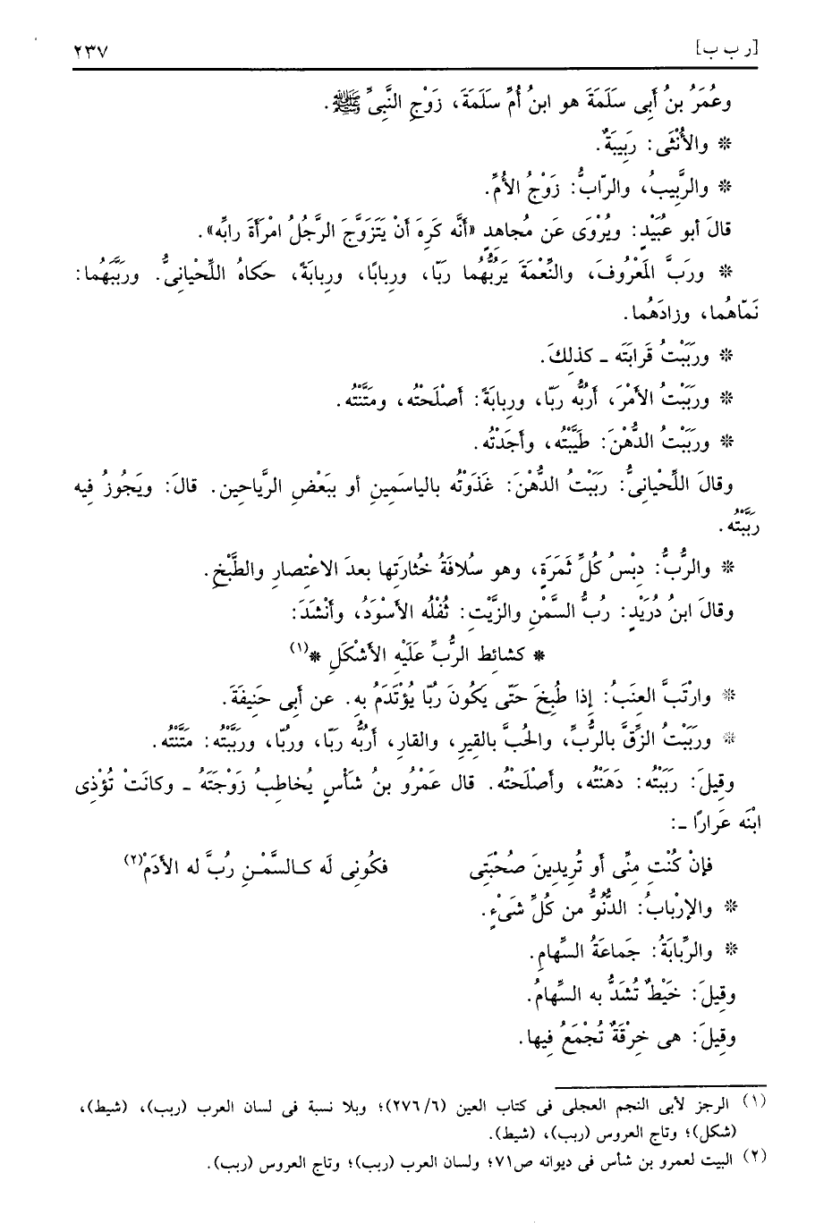 وعُمَرُ بنُ أَبِي سَلَمَةَ هو ابنُ أُمِّ سَلَمَةَ زَوْجِ النَّبِيِّ صلى الله عليه وسلم والأُنْثَى رَبِيبَةٌ والرَّبِيبُ والرّابُّ زَوْجُ الأُمِّ قالَ أبو عُبَيْدٍ ويُرْوَى عَن مُجاهِدٍ أنَّه كَرِهَ أَنْ يَتَزَوَّجَ الرَّجُلُ امْرَأَةَ رابِّه ورَبَّ المَعْرُوفَ والنِّعْمَةَ يَرُبُّهُما رَبّا ورِبابًا ورِبابَةً حَكاهُ اللِّحْيانِيُّ ورَبَّبَهُما نَمّاهُما وزادَهُما ورَبَبْتُ قَرابَتَه كذلِكَ ورَبَبْتُ الأَمْرَ أَرُبُّه رَبّا ورِبابَةً أَصْلَحْتُه ومَتَّنْتُه ورَبَبْتُ الدُّهْنَ طَيَّبْتُه وأَجَدْتُه وقالَ اللِّحْيانِيُّ رَبَبْتُ الدُّهْنَ غَذَوْتُه بالياسَمِينِ أو ببَعْضِ الرَّياحِين قالَ ويَجُوزُ فِيه رَبَّيْتُه والرُّبُّ دِبْسُ كُلِّ ثَمَرَةٍ وهو سُلافَةُ خُثارَتِها بعدَ الاعْتِصارِ والطَّبْخِ وقالَ ابنُ دُرَيْدٍ رُبُّ السَّمْنِ والزَّيْتِ ثُفْلُه الأَسْوَدُ وأَنْشَدَ
