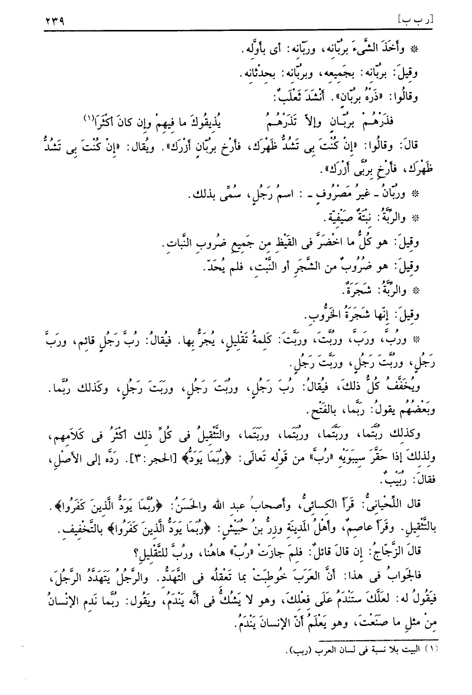 قالَ وقالُوا إِنْ كُنْتَ بِي تَشُدُّ ظَهْرَك فأَرْخ برُبّانٍ أَزْرَك ويُقال إِنْ كُنْتَ بِي تَشُدُّ ظَهْرَك فأَرْخِ بِرُبَّى أَزْرَك ورُبّانُ غيرُ مَصْرُوفٍ اسمُ رَجُلٍ سُمِّي بذلك والرِّبَّةُ نِبْتَةٌ صَيْفِيّة وقِيلَ هو كُلُّ ما اخْضَرَّ في القَيْظِ مِن جَمِيعِِ ضُروبِ النَّباتِ وقِيلَ هو ضُرُوبٌ من الشَّجَرِ أو النَّبْتِ فلم يُحَدّ والرِّبَّةُ شَجَرَةٌ وقِيلَ إِنّها شَجَرَةُ الَخُّروبِ ورُبَّ ورَبَّ ورُبَّتَ ورَبَّتَ كَلِمةُ تَقْلِيلٍ يُجَرُّ بِها فيُقالُ رُبَّ رَجُلٍ قائِم ورَبَّ رَجُلٍ ورُبَّتَ رَجُلٍ ورَبَّتَ رَجُلٍ ويُخَفَّفُ كُلُّ ذلكَ فيُقالُ رُبَ رَجُلٍ ورُبَتَ رَجُلٍ ورَبَتَ رَجُلٍ وكَذلك رُبَّما وبَعْضُهُم يقولُ رَبَّما بالفَتْح وكذلِك رُبَّتَما ورَبَّتَما ورُبَتَما ورَبَتَما والتَّثْقِيلُ في كُلِّ ذلِك أكْثَرُ في كَلاَمِهم ولِذلِكَ إذا حَقَّرَ سِيبَوَيْهِ رُبَّ من قَوْلِه تَعالَى {ربما يود} الحجر 3 رَدَّه إلى الأَصْلِ فقالَ رُبَيْبٌ قال اللِّحْيانِيُّ قَرَأَ الكِسائِيُّ وأَصحابُ عبدِ الله والحَسَنُ {ربما يود الذين كفروا} بالتَّثْقِيلِ وقَرَأَ عاصِمٌ وأَهْلُ المَدِينَةِ وزِرُّ بنُ حُبَيْشٍ {ربما يود الذين كفروا} بالتًّخْفِيفِ قالَ الزَّجّاجُ إِن قالَ قائلٌ فلِمَ جازَتْ رُبّ هاهُنا ورُبَّ للتَّقْلِيلِ فالجَوابُ في هذا أَنَّ العَرَبَ خُوطِبَتْ بما تَعْقِلُه في التَّهَدُّدِ والرَّجُلُ يَتَهَدَّدُ الرَّجُلَ فيَقُولُ له لعَلَّكَ ستَنْدَمُ عَلَى فِعْلِكَ وهو لا يَشُكُّ في أَنَّه يَنْدَمُ ويَقُول رُبَّما نَدِم الإنْسانُ مِنْ مِثلِ ما صَنَعْتَ وهو يَعْلَمُ أَنَّ الإنسانَ يَنْدَمُ