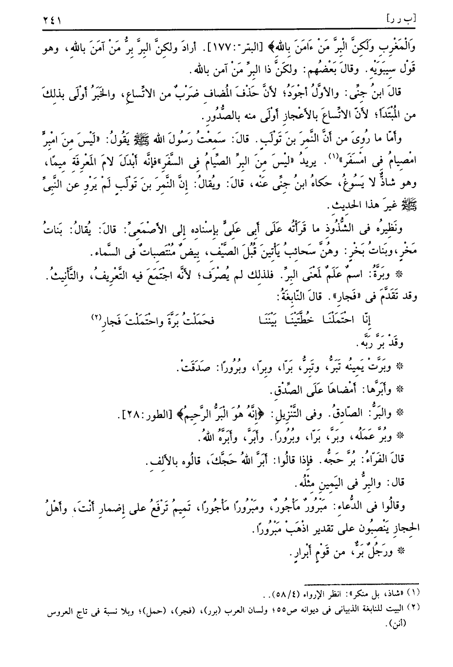 وَالْمَغْرِبِ ولَكِنَّ الْبِرَّ مَنْءَامَنَ بِاللهِ} البقرة 177 أرادَ ولكِنَّ البِرًّ بِرٌّ مَنْ آمَنَ باللهِ وهو قَوْل سِيبَوَيْهِ وقالَ بَعْضُهم ولَكنَّ ذا البِرِّ مَنْ آمن بالله قالَ ابنُ جِنِّي والأوَّلُ أَجْوَدُ لأَنَّ حَذْفَ المُضافِ ضَرْبٌ من الاتِّساعِ والخَبَرُ أَوْلَى بذلِكَ من المُبْتَدَأَ لأَنَّ الاتِّساعَ بالأَعْجازِ أَوْلَى منه بالصُّدُورِ وأَمّا ما رُوِيّ من أَنَّ النَّمِرَ بنَ تَوْلَبٍ قالَ سَمِعْتُ رَسُولَ الله صلى الله عليه وسلم يَقُولُ لَيْسَ مِنَ امْبِرٍّ امْصِيامُ في امْسَفَر يريدُ لَيْسَ مِنَ البِرِّ الصِّيامُ فِي السَّفَرِ فإنَّه أَبْدَلَ لامَ المَعْرِفَةِ مِيمًا وهو شاذٌّ لا يَسُوغُ حَكاهُ ابنُ جِنِّي عَنْه قالَ ويُقالُ إِنَّ النَّمِرَ بنَ تَوْلَبٍ لَمْ يَرْوِ عن النَّبِيِّ صلى الله عليه وسلم غيرَ هذا الحدِيثِ ونَظِيرُه في الشُّذُوذِ ما قَرَأْتُه عَلَى أَبِي عَلِيٍّ بإِسْنادِهِ إِلى الأَصْمَعِيِّ قالَ يُقالُ بَناتُ مَخْرٍ وبَناتُ بَخْرٍ وهُنَّ سَحائِبُ يَأْتِينَ قُبُلَ الصَّيْفِ بِيضٌ مُنْتَصِباتٌ في السَّماء وبَرَّةُ اسمٌ عَلَمٌ لمَعْنَى البِرِّ فلذلِك لم يُصْرَف لأَنَّه اجْتَمَعَ فيه التَّعْرِيفُ والتَّأْنِيثُ وقد تَقَدَّمَ في فَجارِ قالَ النّابِغَةُ