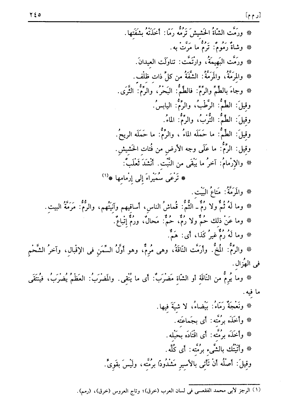 ورَمَّث الشّاةُ الحَشِيشَ تَرُمُّه رَمّا أَخَذَتْهُ بشَفَتِها وشاةٌ رَمُومٌ تَرُمُّ ما مَرَّتْ به ورَمَّت البَهِيمَةُ وارْتَمَّت تناوَلَت العِيدانَ والمِرَمَّةُ والمَرَمَّةُ الشَّفَةُ من كلِّ ذاتِ ظِلْفٍ وجاءَ بالطَّمِّ والرِّمَّ فالطِّمُّ البَحْرُ والرِّمُّ الثَّرَى وقِيلَ الطِّمُّ الرَّطْبُ والرِّمُّ اليابسُ وقِيلَ الطِّمُّ التُّرْبُ والرِّمُّ الماءُ وقِيلَ الطِّمُّ ما حَمَلَه الماءُ والرِّمُّ ما حَمَلَه الريحُ وقِيل الرِّمُّ ما عَلَى وجه الأَرضِ من فُتاتِ الحَشِيشِ والإرْمامُ آخرُ ما يَبْقَى من النَّبْتِ أَنْشَدَ ثَعْلَبٌ