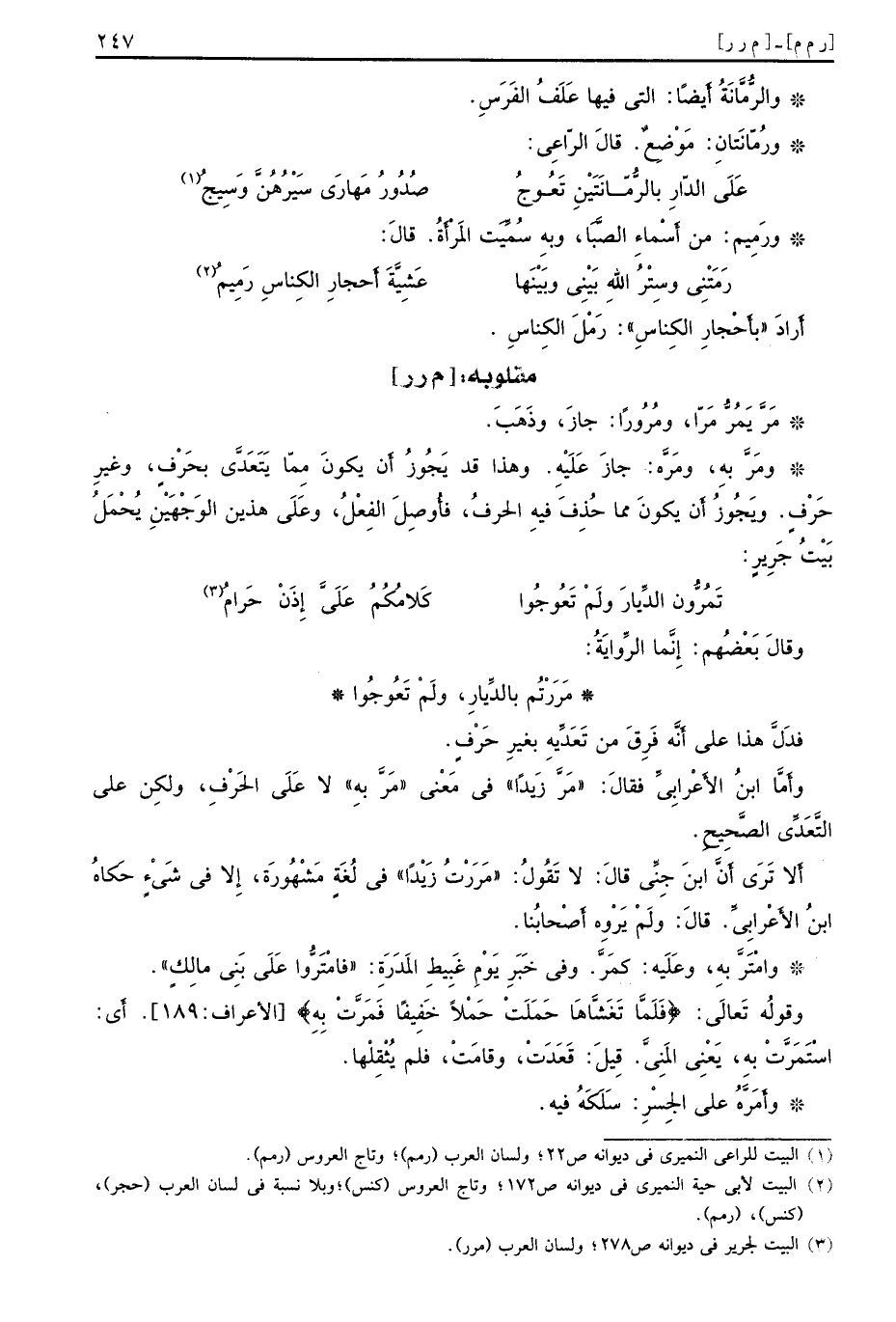 [م ر ر] مَرَّ يَمُرُّ مَرّا ومُرُورًا جازَ وذَهَبَ ومَرَّ بهِ ومَرَّه جازَ عَلَيْهِ وهذا قد يَجُوزُ أَن يكونَ مِمّا يَتَعَدَّى بحَرْفٍ وغيرِ حَرْفٍ ويَجُوزُ أَن يكونَ مما حُذِفَ فيهِ الحرفُ فأُوصِلَ الفِعْلُ وعَلَى هذين الوَجْهَيْنِ يُحْمَلُ بَيْتُ جَرِيرٍ