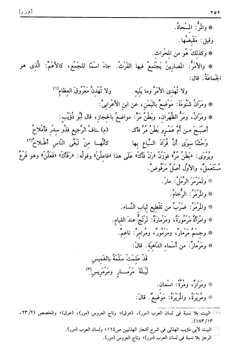 ويُرْوَى بَطْنُ مُرٍّ فوَزْنُ رَنْ فَأَكَ عَلَى هذا فاعِلُنْ وقولُه رَفَأَكَ فَعَلُنْ وهو فَرْعٌ مُسْتَعْملٌ والأَوَّل أَصْلٌ مَرْفُوضٌ وتَمَرْمَرَ الرَّمْلُ مارَ والمَرْمَرُ الرُّخامُ والمَرْمَرُ ضَرْبٌ من تَقْطِيعِ ثِيابِ النِّساء وامْرَأَةٌ مَرْمُورَةٌ ومَرْمارَةٌ تَرْتَجُّ عندَ القِيامِ وجِسْمٌ مَرْمارٌ ومَرْمُورٌ ومُرامِرٌ ناعِمٌ ومَرْمارٌ من أَسْماءِ الدّاهِيَةِ قالَ