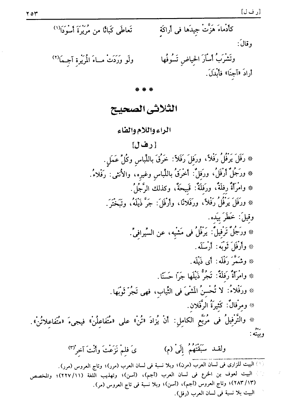 [ر ف ل] رَفَلَ يَرْفُلُ رَفْلاً ورَفِلَ رَفَلاً خَرُقَ باللِّباسِ وكُلِّ عَمَلٍ ورَجُلٌ أَرْفَلُ ورَفِلٌ أَخْرَقُ باللِّباسِ وغيرِه والأُنثى رَفْلاءُ وامْرَأَةٌ رِفِلَةٌ ورَفِلَةٌ قَبِيحَةٌ وكذلك الرَّجُلُ ورَفَلَ يَرْفُلُ رَفْلاً ورَفَلانًا وأَرْفَلَ جَرَّ ذَيْلَهُ وتَبَخْتَرَ وقِيلَ خَطَرَ بِيَدِه ورَجُلٌ تَرْفِيلٌ يَرْفُلُ في مَشْيِه عن السِّيرافِيِّ وأَرْفَلَ ثَوْبَه أَرْسَلَه وشَمَّرَ رَفْلَه أَي ذَيْلَه وامْرَأَةٌ رَفِلَةٌ تَجُرُّ ذَيْلَها جَرًا حَسَنًا ورَفْلاءُ لا تُحْسِنُ المَشْيَ في الثِّيابِ فهي تَجُرَّ ثَوْبَها ومِرْفالٌ كَثِيرَةُ الرَّفَلانِ والتَّرْفِيلُ في مُرَبَّعِ الكامِلِ أَنْ يُزادَ تُنْ على مُتَفاعِلُنْ فيجئَ مُتَفاعِلاتُنْ وبَيْتُه