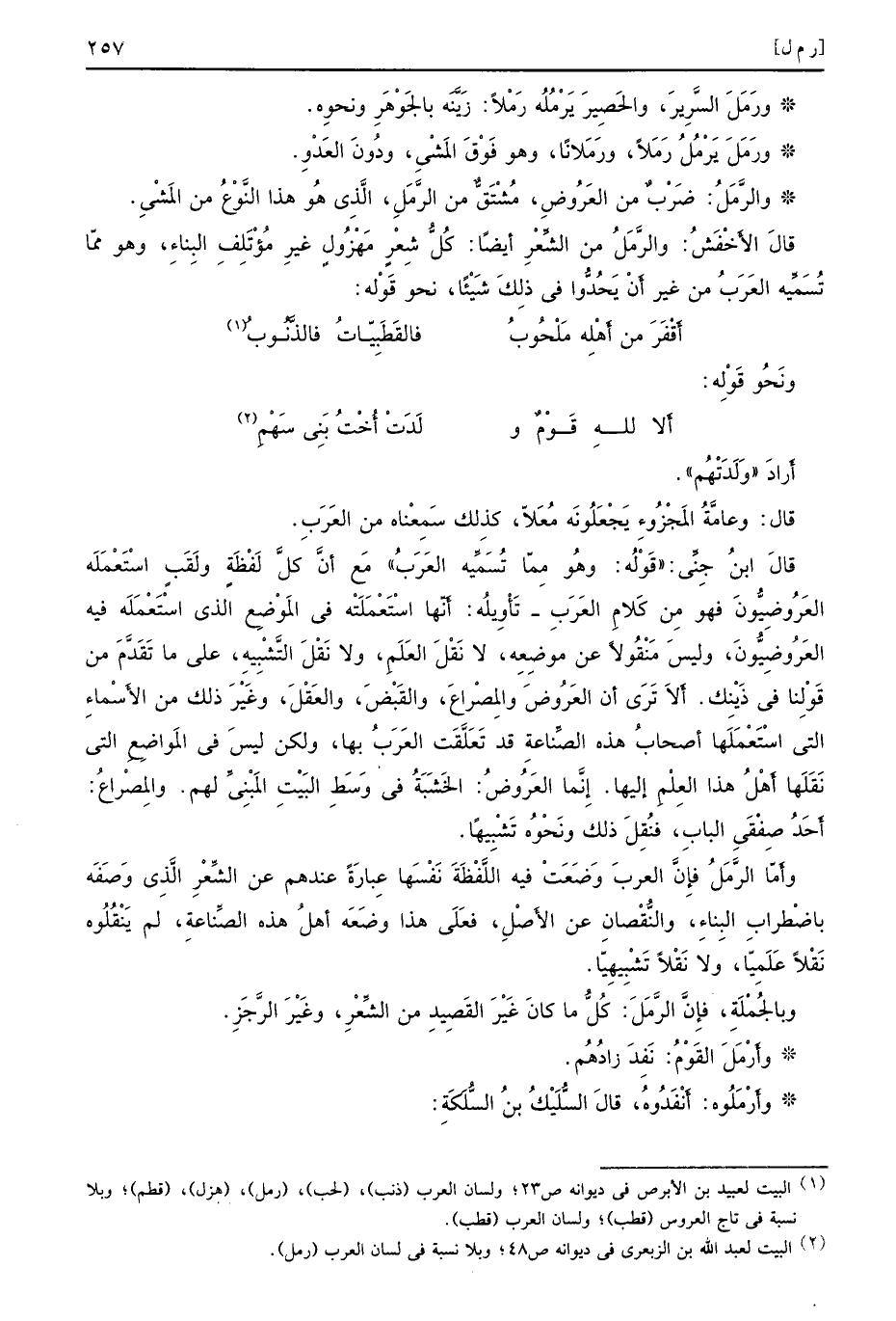 أَرادَ وَلَدَتْهُم قال وعامَّةُ المَجْزُوءِ يَجْعَلُونَه مُعَلاً كذلِك سَمِعْناه من العَرَبِ قالَ ابنُ جِنِّي قَوْلُه وهُو مِمّا تُسَمِّيه العَرَبُ مَع أنَّ كلَّ لَفْظَةٍ ولَقَبٍ اسْتَعْمَلَه العَرُوضِيُّونَ فهو مِن كَلامِ العَرَبِ تأْوِيلُه أَنّها اسْتَعْمَلَتْه في المَوْضِع الذي اسْتَعْمَلَه فيه العَرُوضِيُّونَ وليسَ مَنْقُولاً عن موضِعِه لا نَقْلَ العَلَمِ ولا نَقْلَ التَّشْبِيهِ على ما تَقَدَّمَ من قَوْلِنا في ذَيْنِك أَلاَ تَرَى أن العَرُوضَ والمِصْراعَ والقَبْضَ والعَقْلَ وغَيْرَ ذلك من الأَسْماءِ التي اسْتَعْمَلَها أصحابُ هذه الصِّناعةِ قد تَعَلَّقَت العَرَبُ بها ولكن ليسَ في المَواضِعِ التي نَقَلَها أهْلُ هذا العِلْمِ إليها إِنَّما العَرُوضُ الخَشَبَةُ في وَسَطِ البَيْتِ المَبْنِيِّ لهم والمِصْراعُ أَحَدُ صِفْقَي البابِ فنُقِلَ ذلك ونَحْوُه تَشْبِيهًا وأمّا الرَّمَلُ فإِنَّ العربَ وَضَعَتْ فيه اللَّفْظَةَ نَفْسَها عِبارَةً عندهم عن الشِّعْرِ الَّذِي وَصَفَه باضْطرابِ البِناءِ والنُّقْصانِ عن الأَصْلِ فعَلَى هذا وضَعَه أهلُ هذه الصِّناعةِ لم يَنْقُلُوه نَقْلاً عَلَمِيّا ولا نَقْلاً تَشْبِيهِيًا وبالجُمْلَةِ فإِنَّ الرَّمَلَ كُلُّ ما كانَ غَيْرَ القَصِيدِ من الشِّعْرِ وغَيْرِ الرَّجَزِ وأَرْمَلَ القَوْمُ نَفِدَ زادُهُم وأَرْمَلُوه أَنْفَدُوُه قالَ السُّلَيْكُ بنُ السُّلَكِة