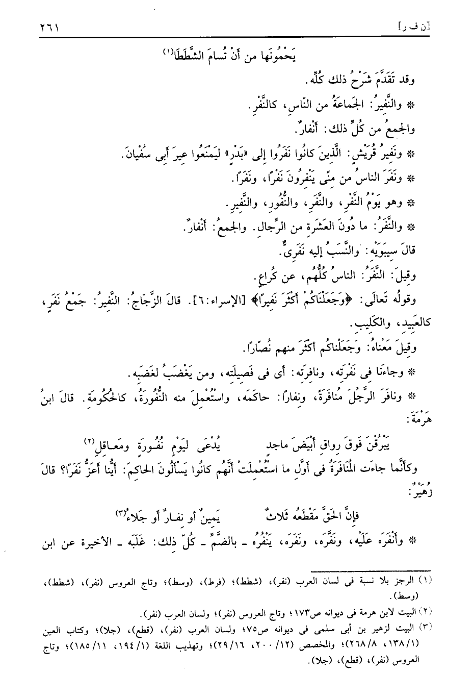 وقد تَقَدَّمَ شَرْحُ ذلك كُلِّه والنَّفِيرُ الجَماعَةُ من النّاسِ كالنَّفْرِ والجمعُ من كُلِّ ذلك أَنْفارٌ ونَفِيرُ قُرَيْشٍ الَّذِينَ كانُوا نَفَرُوا إِلى بَدْرٍ ليَمْنَعُوا عِيرَ أَبِي سُفْيانَ ونَفَرَ الناسُ من مِنًى يَنْفِرُونَ نَفْرًا ونَفَرًا وهو يَوْمُ النَّفْرِ والنَّفَرِ والنُّفُورِ والنَّفِيرِ والنَّفَرُ ما دُونَ العَشَرةِ من الرِّجالِ والجمعُ أَنْفارٌ قالَ سِيبَوَيْهِ والنَّسَبُ إليه نَفَرِيٌّ وقِيلَ النَّفَرُ الناسُ كُلُّهُم عن كُراعٍ وقولُه تَعالَى {وجعلناكم أكثر نفيرا} الإسراء 6 قالَ الزَّجّاجُ النَّفِيرُ جَمْعُ نَفَرٍ كالعَبِيدِ والكَلِيبِ وقِيلَ مَعْناهُ وَجَعَلْناكُم أَكْثَرَ منهم نُصّارًا وجاءَنا في نَفْرَتِه ونافِرَتِه أَي في فَصِيلَتِه ومن يَغْضَبُ لغَضَبِه ونافَرَ الرَّجُلَ مُنافَرَةً ونِفارًا حاكَمَه واسْتُعْمِلَ منه النُّفُورَةُ كالحُكُومَةِ قالَ ابنُ هَرْمَةَ