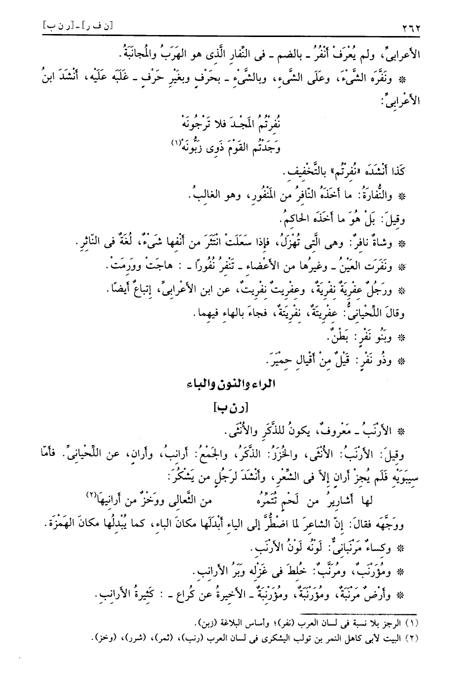 [ر ن ب] والأَرْنَبُ مَعْروفٌ يكونُ للذَّكَرِ والأُنْثَى وقِيلَ الأَرْنَبُ الأُنْثَى والخُزَزُ الذَّكَرُ والجَمْعُ أَرانِبُ وأَرانٍ عن اللِّحْيانِيِّ فأمّا سِيبَوَيْهِ فَلَم يُجِزْ أَرانٍ إِلاّ في الشِّعْرِ وأَنْشَدَ لرَجُلٍ من يَشْكُرَ