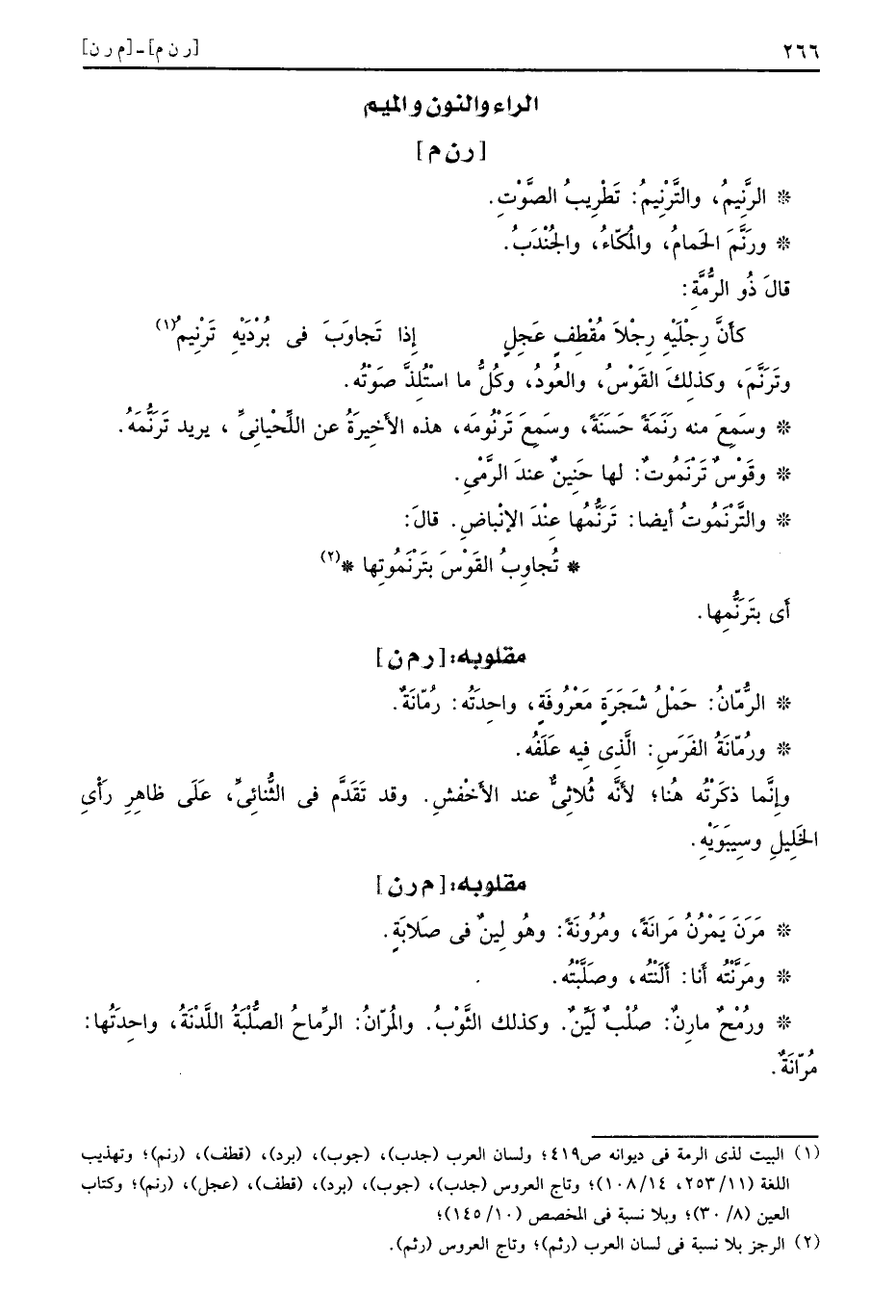 [ر ن م] الرَّنِيمُ والتَّرْنِيمُ تَطْرِيبُ الصَّوْتِ ورَنَّمَ الحَمامُ والمُكّاءُ والجُنْدَبُ قالَ ذُو الرُّمَّةِ