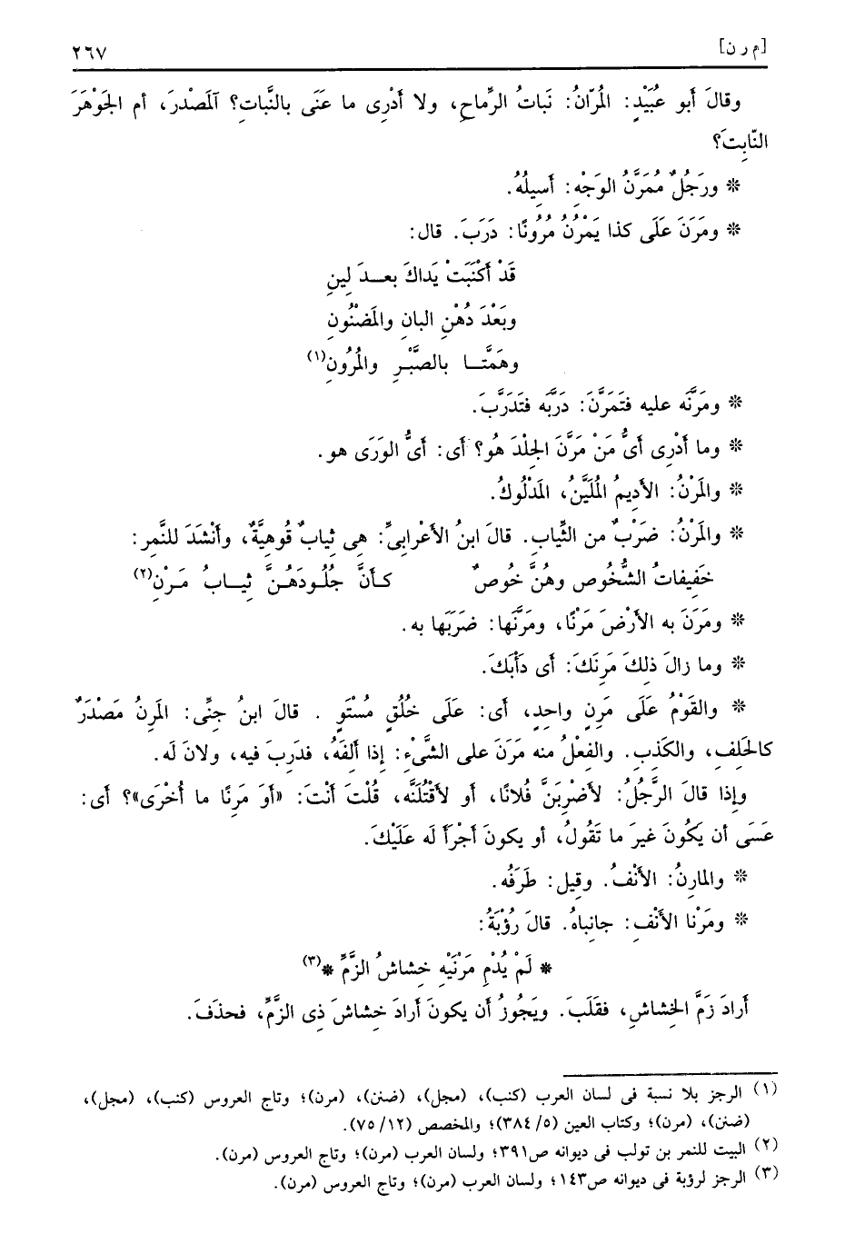 وقالَ أَبو عُبَيْدٍ المُرّانُ نَباتُ الرِّماحٍِ ولا أَدْرِي ما عَنَى بالنَّباتِ المَصْدَرَ أم الجَوْهَرَ النّابِتَ ورَجُلٌ مُمَرَّنُ الوَجْهِ أَسِيلُه ومَرَنَ عَلَى كذا يَمْرُنُ مُرُونًا دَرَبَ قال