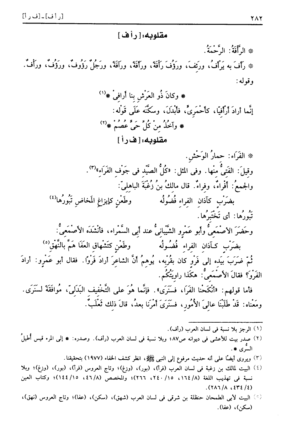 ثُمّ ضَرَبَ بيَدِه إلى فَرْوٍ كان بقُرْبِه يُوهِمُ أَنَّ الشاعِرَ أرادَ فَرْوًا فقال أبو عَمْرٍ وأرادَ الفَرْوَ فقالَ الأَصْمَعِيُّ هكَذا راوِيَتُكُم فأما قولهم أنْكَحْنا الفَرَا فسَنَرَى فإنَّما هُوَ على التَّخْفِيفِ البَدَلِيّ مُوافَقَةً لسَنَرَى ومَعْناه قَدْ طَلَبْنا عالِيّ الأُمُورِ فسَنَرَى أَمْرَنا بعدُ قالَ ذلِك ثَعْلَبٌ