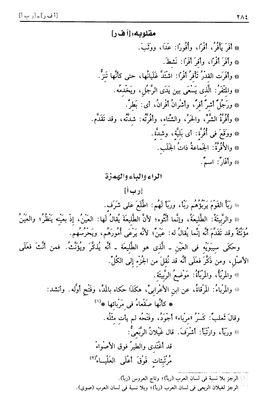 [أف ر] أَفَرَ يَأْفُرُ أَفْرًا وأُفُورًا عَدَا ووَثَبَ وأَفَرَ أَفْرًا وأَفِرَا أَفَرًا نَشِطَ وأَفَرَت القِدْرُ تأْفِرُ أَفْرًا اشْتَدَّ غَلَيانُها حتى كأَنَّها تَنِزُّ والمِئْفَرُ الَّذِي يَسْعَى بين يَدَي الرَّجُلِ ويَخْدِمُه ورَجُلٌ أَشِرٌ أَفِرٌ وأَشْرانُ أَفْرانُ أي بَطِرٌ وأُفُرَّةُ الشَّرِّ والحَرِّ والشِّتاءِ وأَفُرَّتُه شِدَّتُه وقد تَقَدَّم ووقَعَ في أُفُرٍ ة أى بَليَّة وشِدةَّ الأُفُرَّةُ الجَماعةُ ذاتُ الجَلَبِ وأفّارٌ اسمٌ