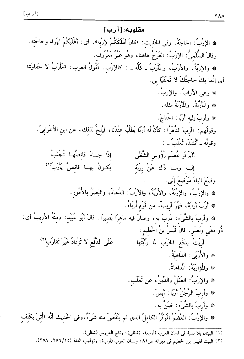 كانَ أَمْلَكَكُمْ لإرْبِه أي أَغْلَبَكُمْ لهَواه وحاجَتِه وقالَ السُّلمِيُّ الإِرْبُ الفَرْجُ هاهنا وهُو غَيْرُ مَعْرُوفٍ والإرْبَةُ والأَرَبُ والمَأْرَبُ كُلُّه كالإرْبِ تَقُولُ العرب مَأْرَبٌ لا حَفاوَة أي إنَّما بكَ حاجتُكَ لا تَحَفِّيًا بِي وهي الآرابُ والإرَبُ والمَأْرُبَةُ والمَأْرَبَةُ مثله وأَرِبَ إليهِ أَرَبًا احْتاجَ وقولُهم أَرِبَ الدَّهْرُ كأنَّ لَه أَرَبًا يَطْلُبُه عِنْدَنا فيُلِحُّ لذلِك عن ابنِ الأعْرابِيِّ وقولُه أَنْشَدَه ثَعْلَبٌ