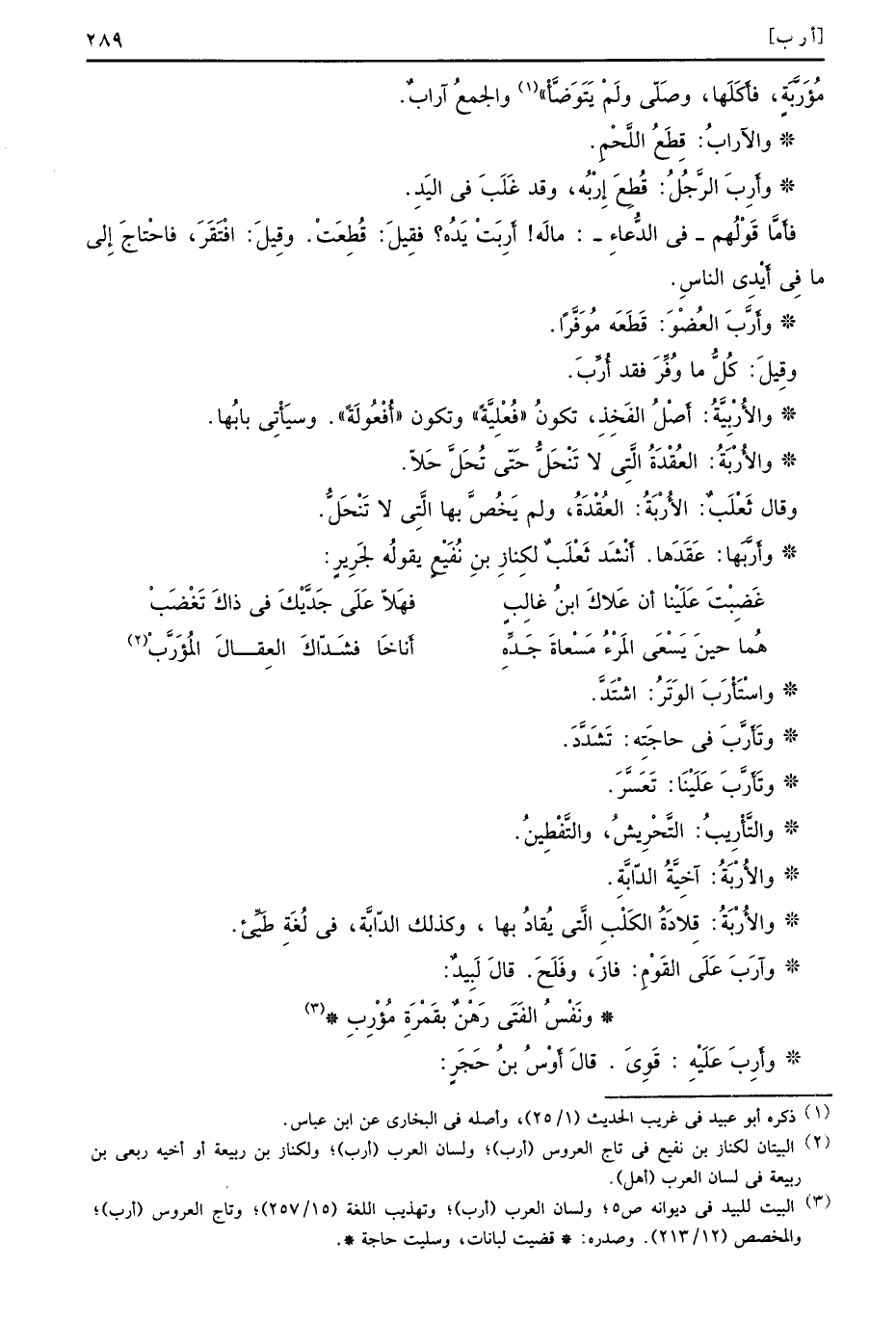 مُؤَرَّبَةٍ فأَكَلَها وصَلّى ولَمْ يَتَوَضَّأْ والجمعُ آرابٌ والآرابُ قِطَعُ اللَّحْمِ وأَرِبَ الرَّجُلُ قُطِعَ إِرْبُه وقد غَلَبَ في اليَدِ فأَمَّا قَوْلُهم في الدُّعاءِ مالَه أَرِبَتْ يَدُه فقِيلَ قُطِعَتْ وقِيلَ افْتَقَرَ فاحْتاجَ إِلى ما فِي أَيْدِي الناسِ وأَرَّبَ العُضْوَ قَطَعَه مُوَفَّرًا وقِيلَ كُلُّ ما وُفِّرَ فقد أُرِّبَ والأُرْبِيَّةُ أَصْلُ الفَخِذِ تكونُ فُعْلِيَّةُ وتكون أُفْعُولَةً وسيَأْتِي بابُها والأُرْبَةُ العُقْدَةُ الَّتِي لا تَنْحَلُّ حَتّى تُحَلَّ حَلاّ وقال ثَعْلَبٌ الأُرْبَةُ العُقْدَةُ ولم يَخُصَّ بها الَّتِي لا تَنْحَلُّ وأَرَّبَها عَقَدَها أَنْشَدَ ثَعْلَبٌ لكِنازِ بنِ نُفَيْعٍ يقولُه لجَرِيرٍ