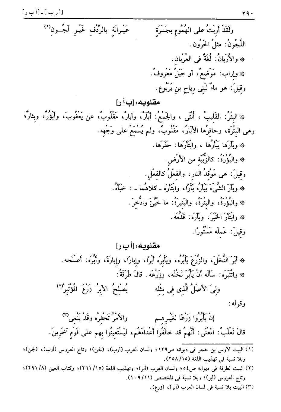 [ب أر] البِئْرُ القَلِيبُ أُنْثَى والجَمْعُ أَبْآرٌ وآبارٌ مَقْلُوبٌ عن يَعْقُوبَ وأَبْؤُرٌ وبِئارٌ وهي البِئْرَة وحافِرُها الأَبّارُ مَقْلُوبٌ ولم يُسْمَعْ على وَجْهِه وبَأَرَها يَبْأَرُها وابْتَأَرَها حَفَرَها والبُؤْرَةُ كالزُّبْيَةِ من الأَرْضِ وقِيلَ هي مَوْقِدُ النارِ والفِعْلُ كالفِعْلِ وبَأَرَ الشَّيْءَ يَبْأَرُه بَأْرًا وابْتَأَرَه كلاهُما خَبَأَهُ والبُؤْرَةُ والبِئْرَةُ والبَئِيرَةُ ما خُبِّئَ وادُّخِرَ وابْتَأَرَ الخَبَرَ وبَأَرَه قَدَّمَه وقِيلَ عَمِلَه مَسْتُورًا