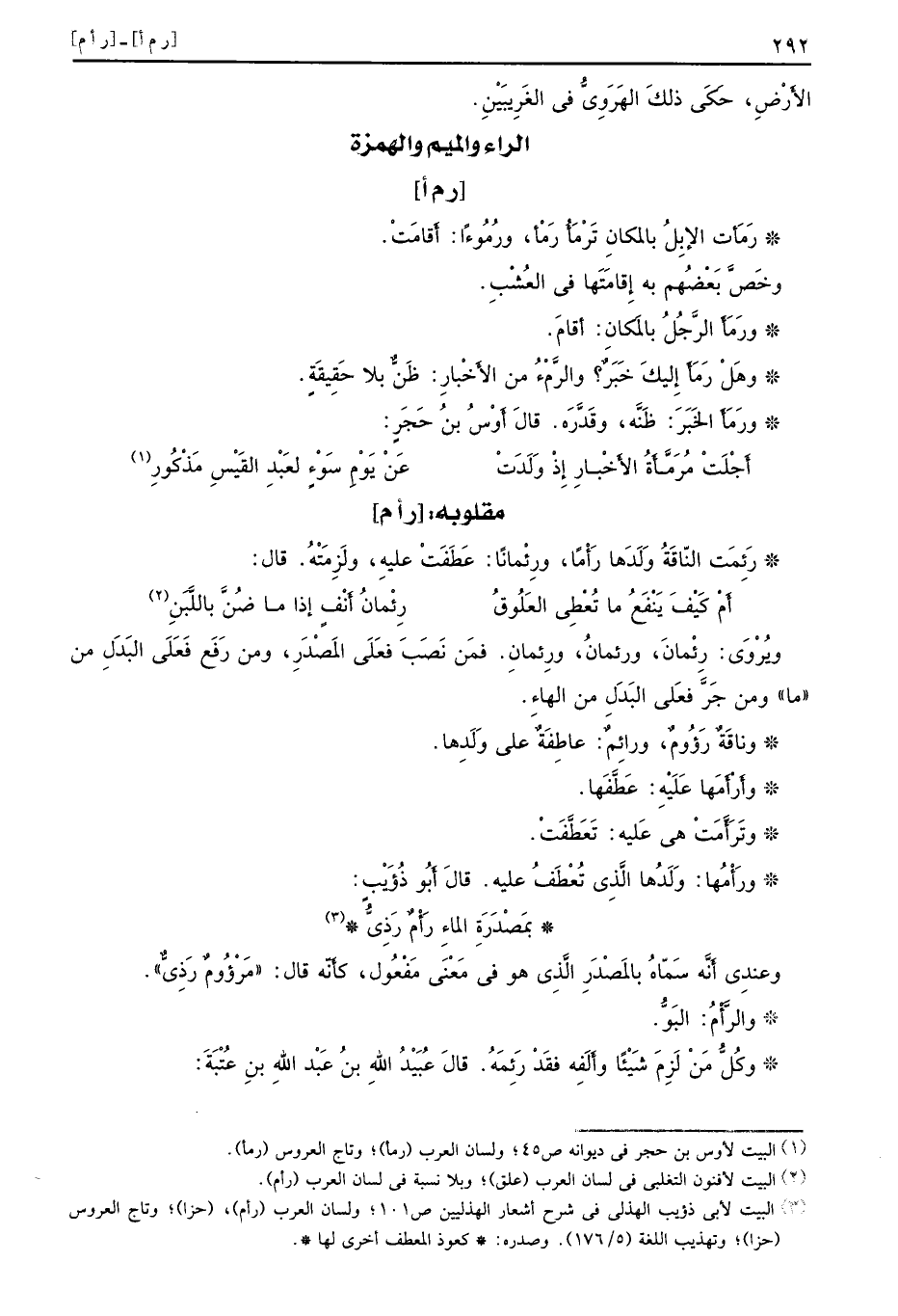 ويُرْوَى رِئْمانَ ورئمانُ ورِئمانِ فمَن نَصَبَ فعَلَى المَصْدَرِ ومن رَفَع فَعَلَى البَدَلِ من ما ومن جَرَّ فعَلى البَدَلِ من الهاءِ وناقَةٌ رَؤُومٌ ورائِمٌ عاطِفَةٌ على وَلَدِها وأَرْأَمَها عَلَيْهِ عَطَّفَها وتَرَأَمَتْ هي عَليه تَعَطَّفَتْ ورَأْمُها وَلَدُها الَّذِي تُعْطَفُ عليه قالَ أَبُو ذُؤَيْبٍ