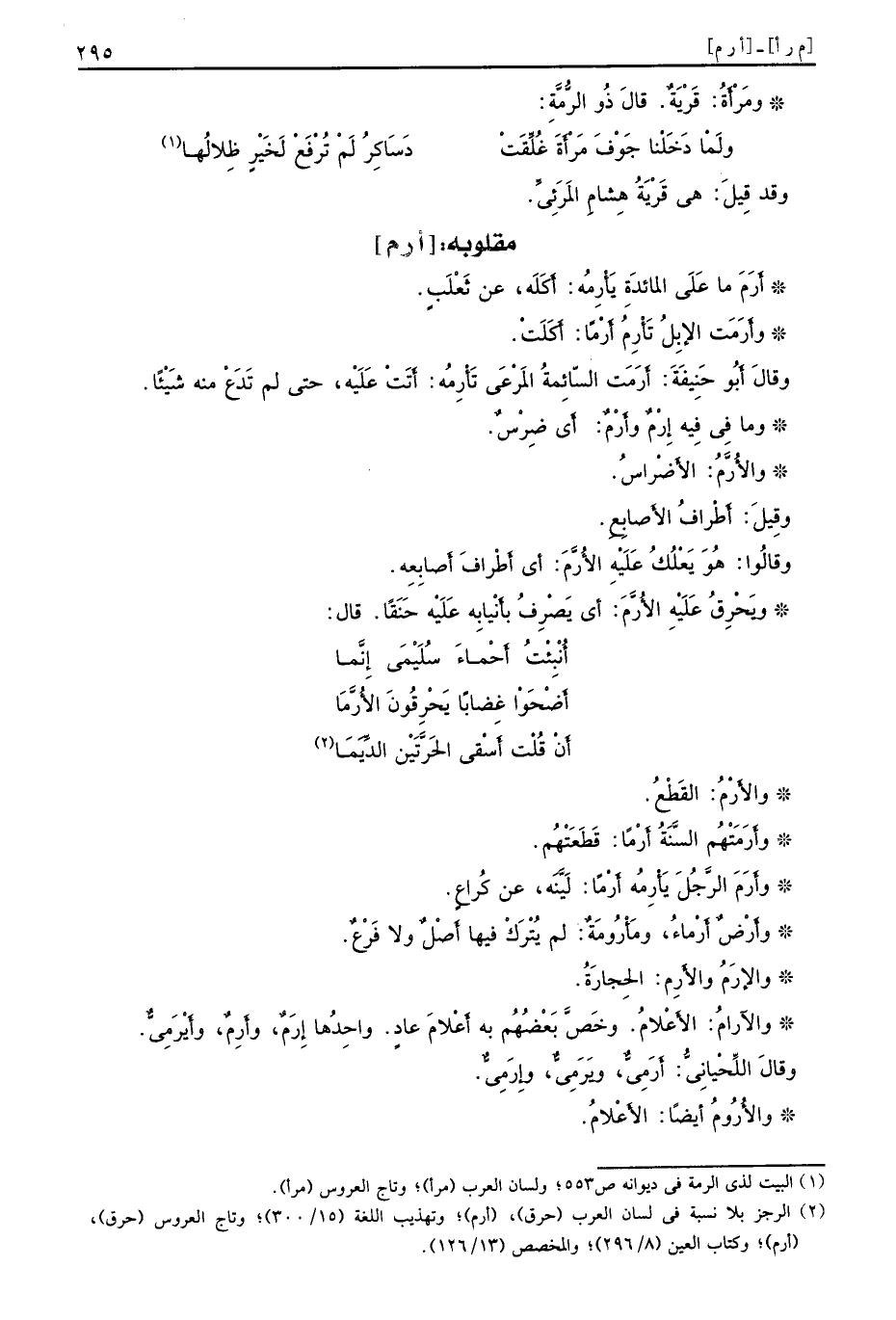 والأَرْمُ القَطْعُ وأَرَمَتْهُم السَّنَةُ أَرْمًا قَطَعَتْهُم وأَرَمَ الرَّجُلَ يَأْرِمُه أَرْمًا لَيَّنَه عن كُراعٍ وأَرْضٌ أَرْماءُ ومَأْرُومَةٌ لم يُتْرَكْ فيها أَصْلٌ ولا فَرْعٌ والإرَمُ والأَرِم الحِجارَةُ والآرامُ الأَعْلامُ وخَصَّ بَعْضُهُم به أَعْلامَ عادٍ واحِدُها إِرَمٌ وأَرِمٌ وأَيْرَمِيٌّ وقالَ اللِّحْيانِيُّ أَرَمِيٌّ ويَرَمِيٌّ وإِرَمِيٌّ والأُرُومُ أيضًا الأَعْلامُ