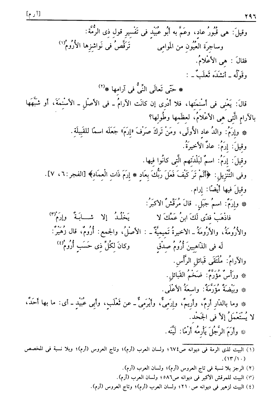 قالَ يَعْنِي في أَسْنِمَتِها فلا أَدْرِي إن كانَت الآرامُ في الأَصْلِ الأَسْنِمَةَ أَو شَبَّهَها بالآرامِ الَّتِي هِي الأَعْلامُ لعِظَمِها وطُولِها وإِرَمُ والدُ عادٍ الأُولَى ومَنْ تَركَ صَرْفَ إِرَمَ جَعَلَه اسمًا للقَبِيلَةِ وقِيلَ إِرَمُ عادٌ الأَخيرَةُ وقِيلَ إِرَمُ اسمٌ لبَلْدَتِهم الَّتِي كانُوا فِيها وفي التَّنْزِيلِ {ألم تر كيف فعل ربك بعاد إرم ذات العماد} الفجر 7 6 وقِيلَ فيها أَيْضًا إِرام وإِرَمٌ اسمُ جَبَلٍ قالَ مُرَقِّشٌ الأكبَرُ