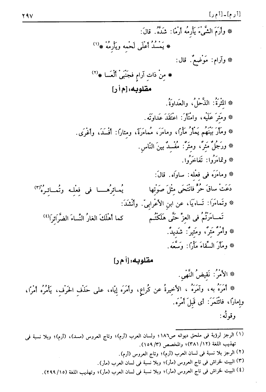 [أم ر] الأَمْرُ نَقِيضُ النَّهْيِ أَمَرَهُ به وآمَرَهُ الأَخِيرةُ عن كُراعٍ وأَمَرَه إِيّاه على حَذْفِ الحَرْفِ يَأْمُرُه أَمْرًا وإِمارًا فائْتَمَرَ أي قَبِلَ أَمْرَه وقولُه