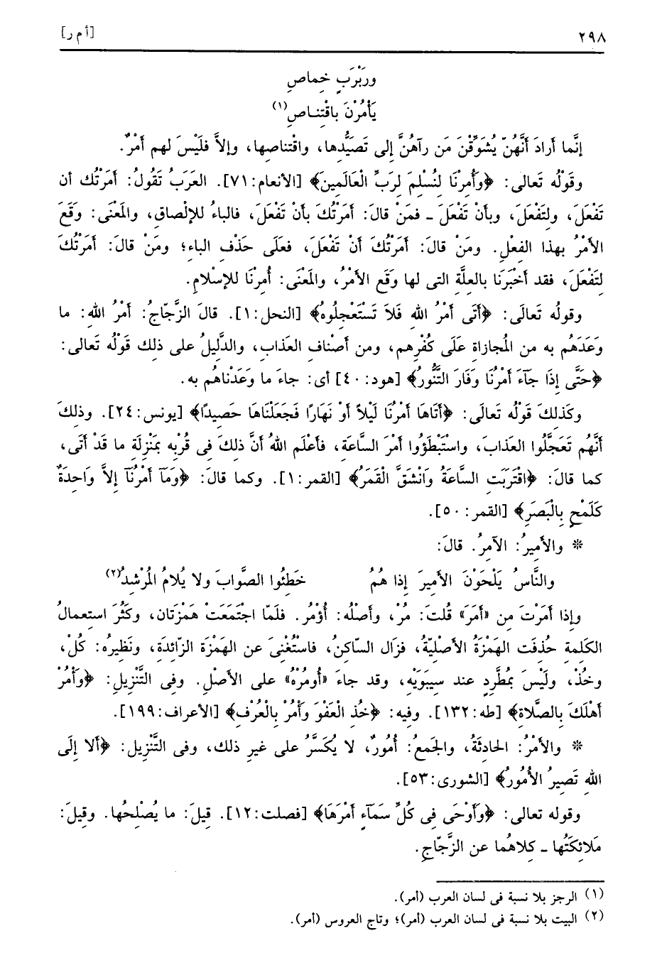 إِنَّما أَرادَ أَنَّهُنّ يُشَوِّقْنَ مَن رآهُنَّ إِلى تَصَيُّدِها واقْتناصِها وإِلاَّ فلَيْسَ لهم أَمْرٌ وقَوْلُه تَعالى {وأمرنا لنسلم لرب العالمين} الأنعام 71 العَرَبُ تَقُولُ أَمَرْتُك أن تَفْعَلَ ولِتَفْعَلَ وبأَنْ تَفْعَلَ فمَنْ قالَ أَمَرْتُكَ بأَنْ تَفْعَلَ فالباءُ للإلْصاقِ والمَعْنَى وَقَعَ الأَمْرُ بهذا الفِعْلِ ومَنْ قالَ أَمَرْتُكَ بأَنْ تَفْعَلَ فعَلَى حَذْفِ الباءِ ومَنْ قالَ أَمَرْتُكَ لِتَفْعَلَ فقد أَخْبَرَنا بالعِلَّةِ التي لها وَقَع الأَمْرُ والمَعْنَى أُمِرْنَا للإسْلامِ وقولُه تَعالَى {أتى أمر الله فلا تستعجلوه} النحل 1 قالَ الزَّجّاجُ أَمْرُ اللهِ ما وَعَدَهُم به من المُجازاةِ عَلَى كُفْرِهم ومن أَصْنافِ العَذابِ والدَّلِيلُ على ذلِك قَوْلُه تَعالى {حتى إذا جاء أمرنا وفار التنور} هود 40 أي جاءَ ما وَعَدْناهُم به وكَذلِكَ قَوْلُه تَعالَى {أتاها أمرنا ليلا أو نهارا فجعلناها حصيدا} يونس 24 وذلِكَ أَنَّهُم تَعَجَّلُوه العَذابَ واسْتَبْطَؤُوا أَمْرَ السَّاعَةِ فأَعْلَم اللهُ أَنَّ ذلِكَ فِي قُرْبِه بمَنْزِلَةِ ما قَدْ أَتَى كما قالَ {اقتربت الساعة وانشق القمر} القمر 1 وكما قالَ {وما أمرنا إلا واحدة كلمح بالبصر} القمر 50 والأَمِيرُ الآمِرُ قالَ
