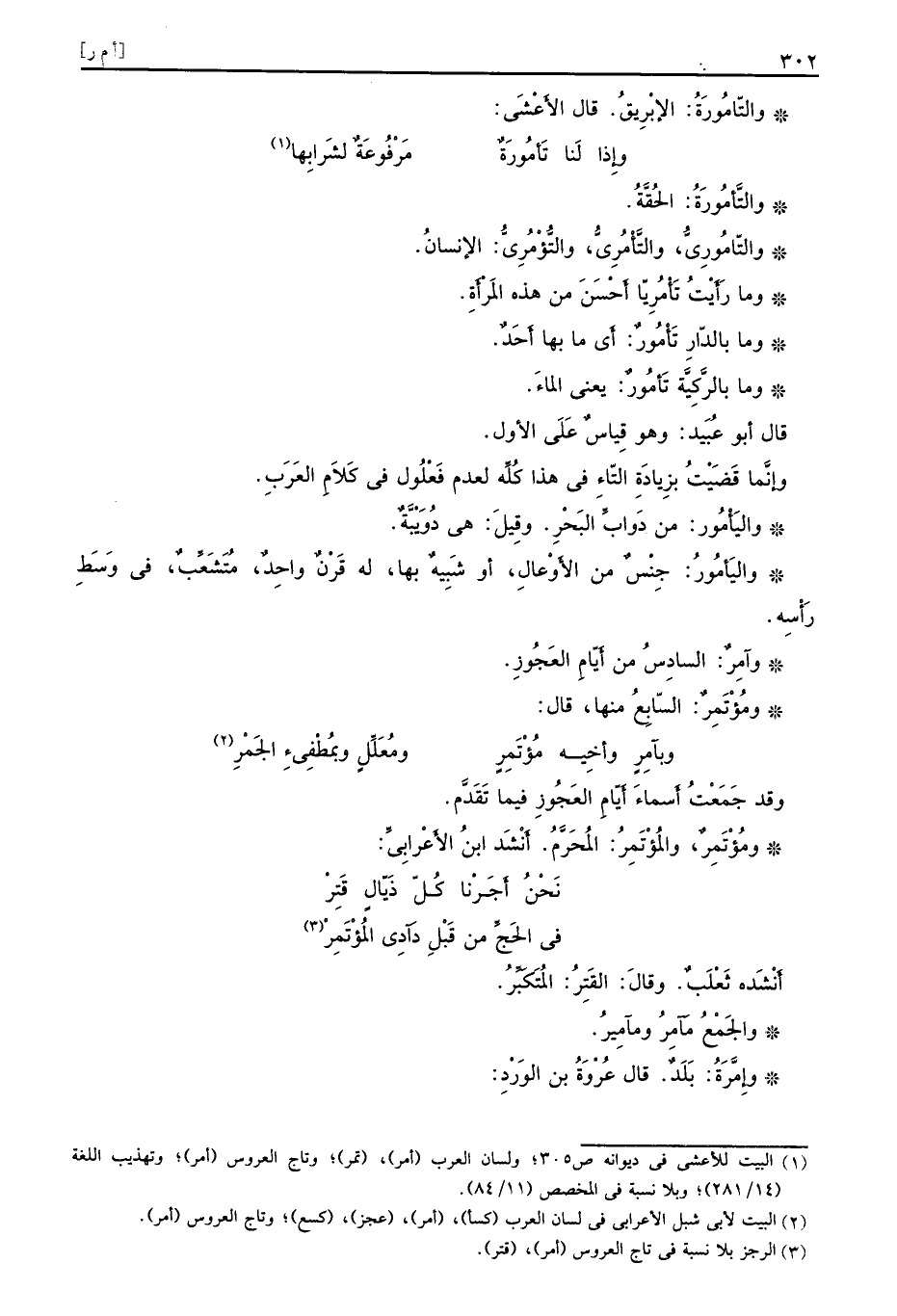 والتَّامُورَةُ الحُقَّةُ والتّامُورِيُّ والتَّأْمُرِيُّ والتُّؤْمُرِيُّ الإنسانُ وما رأَيْتُ تأْمُرِيّا أَحْسَنَ من هذه المَرْأَةِ وما بالدّارِ تَأْمُورٌ أَي ما بها أَحَدٌ وما بالرَّكِيَّة تأمُورٌ يعني الماءَ قال أبو عُبَيد وهو قِياسٌ عَلَى الأول وإنَّما قَضَيْتُ بزِيادَةِ التّاءِ في هذا كُلِّه لعدم فَعْلُول في كَلاَمِ العَرَبِ واليَأْمُور من دَوابِّ البَحْرِ وقِيلَ هي دُوَيْبَّةٌ واليَأمُورُ جِنْسٌ من الأَوْعالِ أو شَبِيهٌ بها له قَرْنٌ واحِدٌ مُتَشَعِّبٌ في وَسَطِ رَأْسِه وآمِرٌ السادِسُ من أَيّامِ العَجُوزِ ومُؤْتَمِرٌ السّابِعُ منها قال