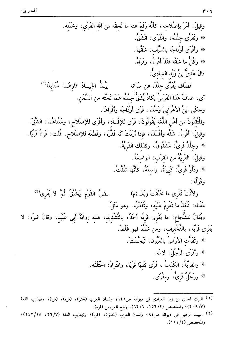 أي صافَ هَذا الفَرَسُ يكادُ يُشَقُّ جِلْدُه عَمّا تَحْتَه من السَّمْنِ وحكَى ابنُ الأَعْرابِيِّ وَحْدَه فَرَى أَوْدَاجَه وأَفْراهَا والمُتْقِنُونَ من أَهْلِ اللُّغَةِ يَقُولُونَ فَرَى للإفْسادِ وأَفْرَى للإصلاحِ ومَعْناهُما الشَّقّ وقِيلَ أَفْراهُ شَقَّه وأَفْسَدَه فإِذا أَرَدْتَ أَنّه قَدَّرَه وقَطَعَه للإصْلاحِ قُلت فَراهُ فَرْيًا وجِلْدٌ فَرِيٌّ مَشْقُوقٌ وكذلِك الفَرِيَّةُ وقيلَ الفَرِيَّةُ من القِرَبِ الواسِعَةُ ودَلْوٌ فَرِيٌّ كَبِيرَةٌ واسِعَةٌ كأَنَّها شُقَّتْ وقوْلُه