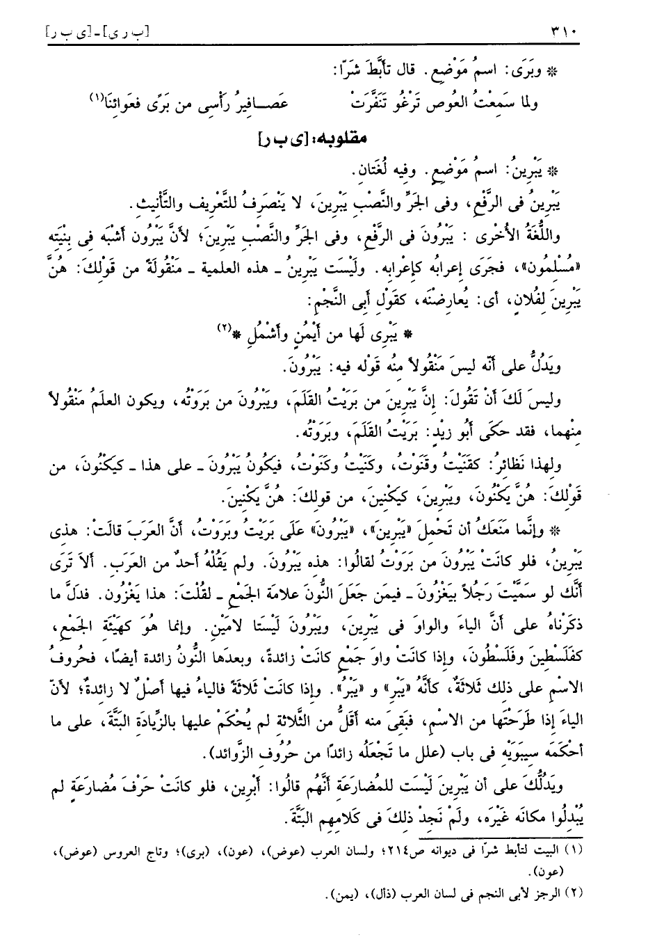 [ي ب ر] يَبْرِينُ اسمُ مَوْضِعٍ وفِيه لُغَتانِ يَبْرِينُ في الرَّفْعِ وفي الجَرِّ والنَّصْبِ يَبْرِينَ لا يَنْصَرِفُ للتَّعْرِيف والتَّأْنِيثِ واللُّغَةُ الأُخْرى يَبْرُونَ في الرَّفْعِ وفي الجَرِّ والنَّصْبِ يَبْرِينَ لأَنَّ يَبْرُون أَشْبَه في بِنْيَتِه مُسْلِمُون فجَرَى إِعْرابُه كإِعْرابِه ولَيْسَت يَبْرِينُ هذه العلمية مَنْقُولَةٌ من قَوْلِكَ هُنَّ يَبْرِينَ لِفُلانٍ أي يُعارِضْنَه كقَوْلِ أَبِي النَّجْمِ