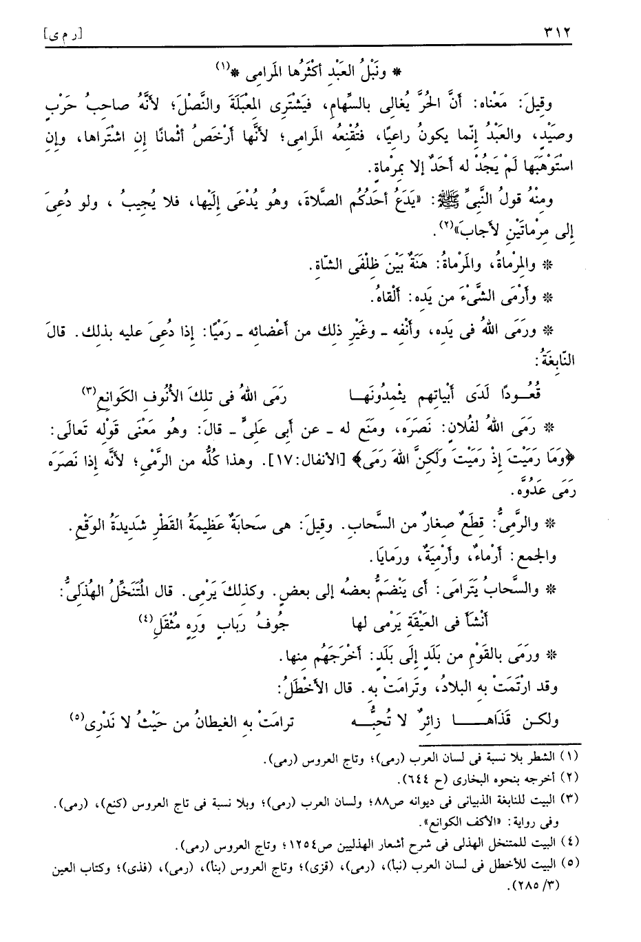 يَدَعُ أَحَدُكُم الصَّلاةَ وهُو يُدْعَى إِلَيْها فلا يُجِيبُ ولو دُعِيَ إِلى مِرْماتَيْنِ لأَجابَ والمِرْماةُ والمَرْماةُ هَنَةٌ بَيْنَ ظِلْفَي الشّاةِ وأَرْمَى الشَّيْءَ من يَدِه أَلْقاهُ ورَمَى اللهُ في يَدِه وأَنْفِه وغَيْرِ ذلِك من أَعْضائِه رَمْيًا إِذا دُعِيَ عليه بذلِك قالَ النّابِغَةُ