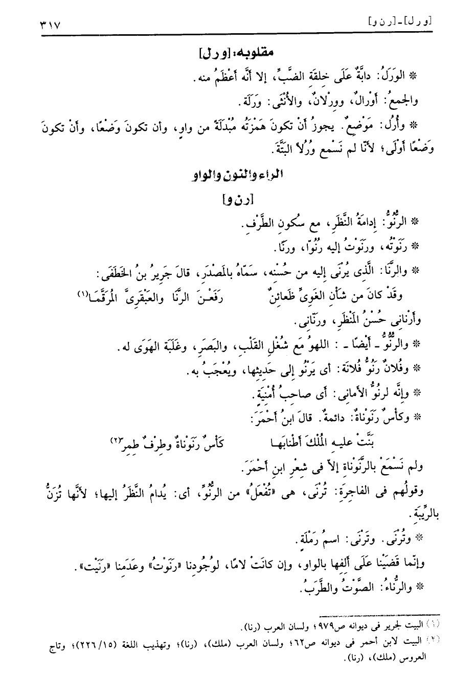 [ر ن و] الرُّنُوُّ إِدامَةُ النَّظَرِ مع سُكونِ الطَّرْفِ رَنَوْتُه ورَنَوْتُ إليه رُنُوّا ورَنًا والرَّنَا الَّذِي يُرْنَى إِليه من حُسْنِه سَمّاهُ بالمَصْدَرِ قالَ جَرِيرُ بنُ الخَطَفَي