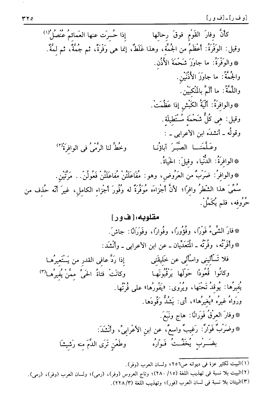 الوافِرَةُ الدُّنْيا وقِيلَ الحَياةُ والوافِرُ ضَرْبٌ من العَرُوضِ وهو مُفَاعَلَتُنْ مُفاعَلَتُنْ فَعُولُنْ مَرَّتِيْنِ سُمِّيَ هذا الشّطرُ وافِرًا لأَنَّ أَجْزاءَه مُوَفَّرَةٌ له وُفُورَ أَجْزاءِ الكامِلِ غيرَ أَنَّه حُذِف من حُرُوفِه فلم يُكَمًّلْ