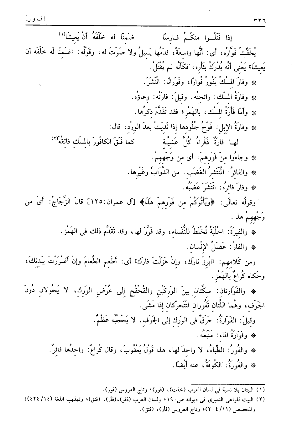 وجاءُوا مِنْ فَوْرِهِمْ أي مِن وَجْهِهِمْ والفائِرُ المُنْتَشِرُ الغَضَبِ من الدَّوَابِّ وغَيْرِها وفارَ فائِرُه انْتَشَرَ غَضَبُه وقولُه تعالَى {ويأتوكم من فورهم هذا} آل عمران 125 قالَ الزَّجّاجُ أَيْ من وَجْهِهِمْ هذا والفِيرَةُ الحُلْبَةُ تُخْلَطُ للنُّفَساءِ وقد فَوَّرَ لها وقد تَقَدَّم ذلك في الهَمْز والفارُ عَضَلُ الإِنْسانِ ومن كَلامِهِم ابْرِزْ نارَك وإِنْ هَزَلْتَ فارَك أي أَطْعِم الطَّعامَ وإنْ أَضْرَرْتَ ببَدِنِكَ وحَكاه كُراعٌ بالهَمْزِ والفَوّارتانِ سِكَّتانِ بينَ الوَرِكَيْنِ والقُحْقُحِ إِلى عُرْضِ الوَرِكِ لا يَحُولانِ دُونَ الجَوْفِ وهُما اللَّتانِ تَفُورانِ فتَتَحرّكانِ إِذا مَشَى وقِيلَ الفَوّارَةُ حَرْقٌ في الوَرِكِ إلى الجَوْفِ لا يَحْجُبُه عَظْمٌ وفَوَارَةُ الماءِ مَنْبَعُه والفُورُ الظِّباءُ لا واحِدَ لها هذا قَوْلُ يَعْقُوبَ وقال كُراعٌ واحِدُها فائِرٌ والفُورَةُ الكُوفَةُ عنه أَيْضًا