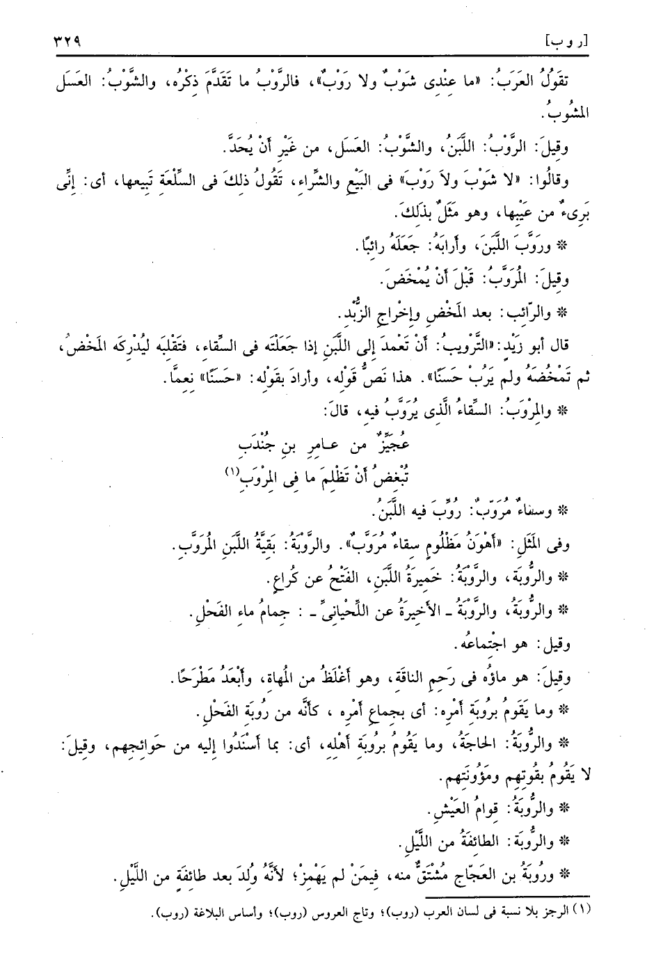 وسناءٌ مُرَوّبٌ رُوِّبَ فيه اللَّبَنُ وفي المَثَلِ أَهْوَنُ مَظْلُومٍ سِقاءٌ مُرَوَّبٌ والرَّوْبَةُ بَقِيَّةُ اللَّبَنِ المُرَوَّبِ والرُّوبَة والرَّوْبَةُ خَمِيرَةُ اللَّبَنِ الفَتْحُ عن كُراعٍ والرُّوبَةُ والرَّوْبَةُ الأَخِيرَةُ عن اللِّحْيانِيِّ جِمامُ ماءِ الفَحْلِ وقيل هو اجْتِماعُه وقِيلَ هو ماؤُه في رَحِمِ الناقَةِ وهو أَغْلَظُ من المُهاةِ وأَبْعَدُ مَطْرَحًا وما يَقَومُ برُوبَةِ أَمْرِه أي بجِماعٍ أَمْرِه كأَنَّه من رُوبَةِ الفَحْلِ والرُّوبَةُ الحاجَةُ وما يَقُومُ برُوبَةِ أَهْلِهِ أي بما أَسْنَدُوا إِليه من حَوائِجِهم وقِيلَ لا يَقُومُ بقُوتِهِم ومَؤُونَتِهم والرُّوبَةُ قِوامُ العَيْشِ والرُّوبَة الطائِفَةُ من اللَّيْلِ ورُوبَةُ بن العَجّاج مُشْتَقٌّ منه فِيمَنْ لم يَهْمِزْ لأَنَّهُ وُلِدَ بعد طائِفَةٍ من اللَّيْلِ