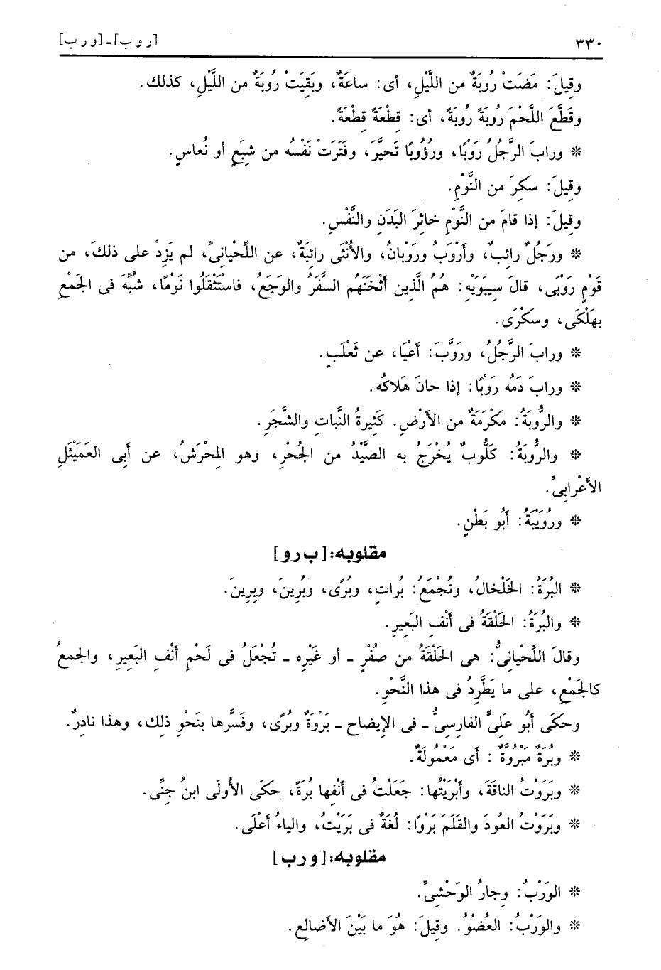 وقِيلَ مَضَتْ رُوبَةٌ من اللَّيْلِ أي ساعَةٌ وبَقِيَتْ رُوبَةٌ من اللَّيْلِ كذلك وقَطَّعَ اللَّحْمَ رُوبَةً رُوبَةً أي قِطْعَةً قِطْعَةً ورابَ الرَّجُلُ رَوْبًا ورُؤُبًا تَحيَّرَ وفَتَرَتْ نَفْسُه من شِبَعٍ أو نُعاسٍ وقِيلَ سَكِرَ من النَّوْمِ وقِيلَ إذا قامَ من النَّوْمِ خائِرَ البَدَنِ والنَّفْسِ ورَجُلٌ رائِبٌ وأَرْوَبُ ورَوْبانُ والأُنْثَى رائِبَةٌ عن اللِّحْيانِيِّ لم يَزِدْ على ذلكَ من قَوْمٍ رَوْبَى قالَ سِيبَوَيْهِ هُمُ الَّذِين أَثْخَنَهُم السَّفَرُ والوَجَعُ فاسْتَثْقَلُوا نَوْمًا شُبِّهَ في الجَمْعِ بهَلْكَى وسَكْرَى ورابَ الرَّجُلُ ورَوَّبَ أَعْيَا عن ثَعْلَبٍ ورابَ دَمُه رَوْبًا إذا حانَ هَلاكُه والرُّوبَةُ مَكْرَمَةٌ من الأَرْضِ كَثِيرَةُ النَّباتِ والشَّجَرِ والرُّوبَةُ كَلُّوبٌ يُخْرَجُ به الصَّيْدُ من الجُحْرِ وهو المِحْرَشُ عن أَبِي العَمَيْثَلِ الأَعْرابِيِّ ورُوَيْبَةُ أَبُو بَطْنٍ