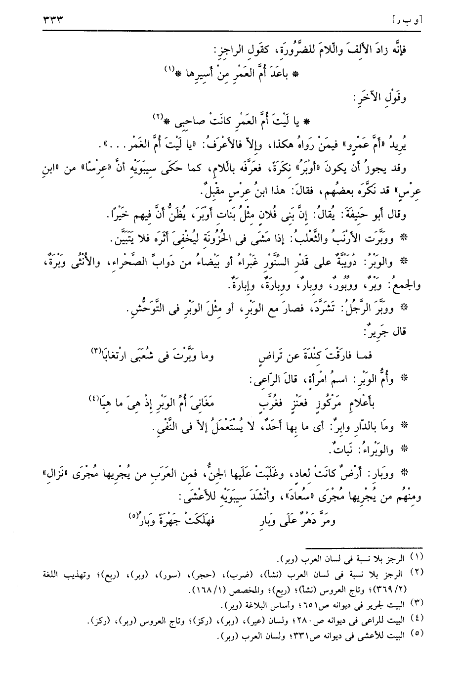 يُرِيدُ أَمَّ عَمْرٍ وفيمَنْ رَواهُ هكذا وإِلاّ فالأَعْرَفُ يا لَيْتَ أُمَّ الغَمْر وقد يجوزُ أَن يكونَ أَوْبَرُ نِكَرَةً فعَرَّفَه بالّلامِ كما حَكَى سِيبَوَيْهِ أنَّ عِرْسًا من ابنِ عِرْسٍ قد نَكَّرَه بعضُهم فقالَ هذا ابنُ عِرْسٍ مقْبِلٌ وقال أَبو حَنِيفَةَ يُقالُ إِنَّ بَنِي فُلانٍ مِثْلُ بَناتِ أَوْبَرَ يُظَنُّ أَنَّ فِيهم خَيْرًا ووَبَّرَت الأَرْنَبُ والثَّعْلَبُ إذا مَشَى في الحُزُونَةِ ليُخْفِيَ أَثَره فلا يَتَبَيَّن والوَبْرُ دُوَيْبَّةٌ على قَدْرِ السِّنَّوْرِ غَبْراءُ أو بَيْضاءُ من دَوابِّ الصَّحْراءِ والأُنْثُى وَبْرَةٌ والجمعُ وَبْرٌ ووُبُورٌ ووِبارٌ ووِبارَةٌ وإِبارَةٌ ووَبَّرَ الرَّجُلُ تَشَرَّدَ فصارَ مع الوَبْرِ أو مِثْلِ الوَبْرِ في التَّوَحُّشِ قال جَرِيرٌ