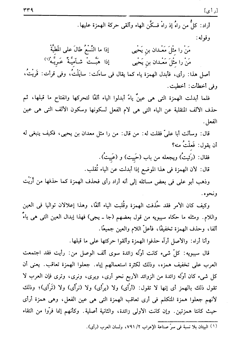 أصل هذا رأى فأبدل الهمزة ياء كما يقال في ساءَلت سايَلْتُ وفي قرأت قَريْتُ وفي أخطأت أخطيت فلما أبدلت الهمزة التي هي عينٌ ياءً أبدلوا الياء ألفًا لتحركها وانفتاح ما قبلها ثم حذف الألف المنقلبة عن الياء التي هي لام الفعل لسكونها وسكون الألف التي هي عين الفعل قال وسألت أبا عليّ فقلت له من قال من را مثل معدان بن يحيى فكيف ينبغي له أن يقول فَعِلْتُ منه فقال رَئيتُ ويجعله من باب حَييت وعَيِيتُ قال لأن الهمزة في هذا الموضع إذا أبدلت عن الياء تُقلب وذهب أبو علي في بعض مسائله إلى أنه أراد رأى فحذف الهمزة كما حذفها من أَرَيْت ونحوه وكيف كان الأمر فقد حُذفت الهمزة وقُلبت الياء ألفًا وهذا إعلالان تواليا في العين واللام ومثله ما حكاه سيبويه من قول بعضهم جا يجي فهذا إبدال العين التي هي ياءٌ ألفا وحذف الهمزة تخفيفًا فأعلّ اللام والعين جميعًا وأنا أراه والأصل أرآه حذفوا الهمزة وألقوا حركتها على ما قبلها قال سيبويه كلّ شيء كانت أوّله زائدة سوى ألف الوصل من رأيت فقد اجتمعت العرب على تخفيف همزه وذلك لكثرة استعمالهم إياه جعلوا الهمزة تعاقب يعني أن كل شيء كان أوّله زائدة من الزوائد الأربع نحو أرى ويرى ونرى وترى فإن العرب لا تقول ذلك بالهمز أي إنها لا تقول أرْأى ولا نرْأى ولا نرْأى ولا تَرْأى وذلك لأنهم جعلوا همزة المتكلم في أرى تعاقب الهمزة التي هي عين الفعل وهي همزة أرأى حيث كانتا همزتين وإن كانت الأولى زائدة والثانية أصلية وكأنهم إنما فرّوا من التقاء