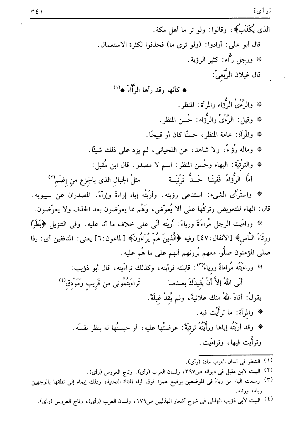 واستَرْأَى الشيء استدعى رؤيته وأرَيتُه إياه إراءةً وإرآءً المصدران عن سيبويه قال الهاء للتعويض وتركُها على ألا يُعوّض وَهُم مما يعوّضون بعد الحذف ولا يعوّضون وراءَيت الرجل مُراءَاةً ورياءً أَريْته أنّي على خلاف ما أنا عليه وفي التنزيل {بَطَرًا ورِئَاءَ النَّاسِ} الأنفال 47 وفيه {الَّذِينَ هُمْ يُرَاءُونَ} الماعون 6 يعني المنافقين أي إذا صلى المؤمنون صلَّوا معهم يُرونهم أنهم على ما هُم عليه وراءَيْتُه مُراءاةً ورِياءً قابلته فرأيته وكذلك تراءَيته قال أبو ذؤيب