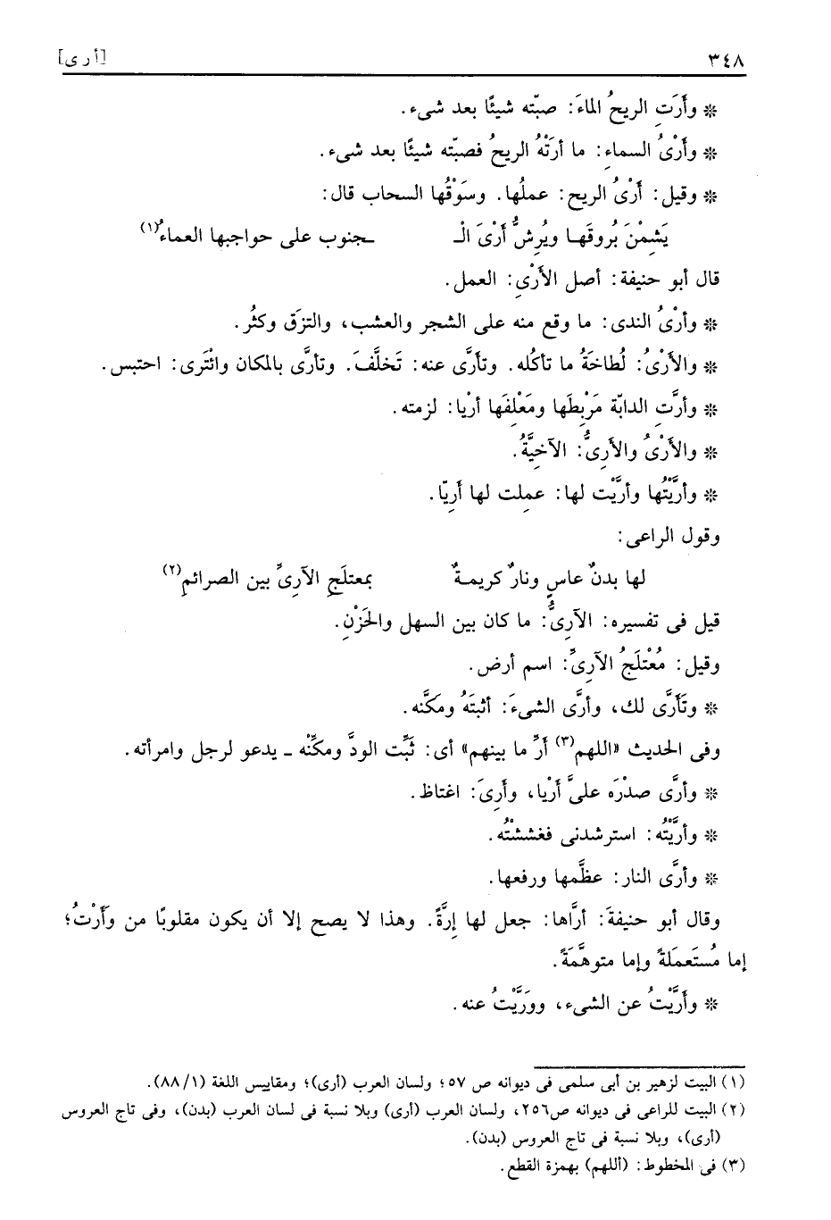 قيل في تفسيره الآرِيُّ ما كان بين السهل والحَزْنِ وقيل مُعْتَلجُ الآرِيِّ اسم أرض وتَأَرَّى لك وأَرَّى الشيءَ أثبَتُه ومَكَّنه وفي الحديث اللهم أَرِّ ما بينهم أي ثَبِّت الودَّ ومكِّنْه يدعو لرجل وامرأته وأرَّى صدْرَه عليَّ أَرْيا وأَرِيَ اغتاظ وأرَّيْتُه استرشدني فغششْتُه وأرَّى النار عظَّمها ورفعها وقال أبو حنيفةَ أرَّاها جعل لها إِرَّةً وهذا لا يصح إلا أن يكون مقلوبًا من وَأَرْتُ إما مُستَعمَلةً وإما متوهَّمَةً وأَرَّيْتُ عن الشيء ووَرَّيتُ عنه