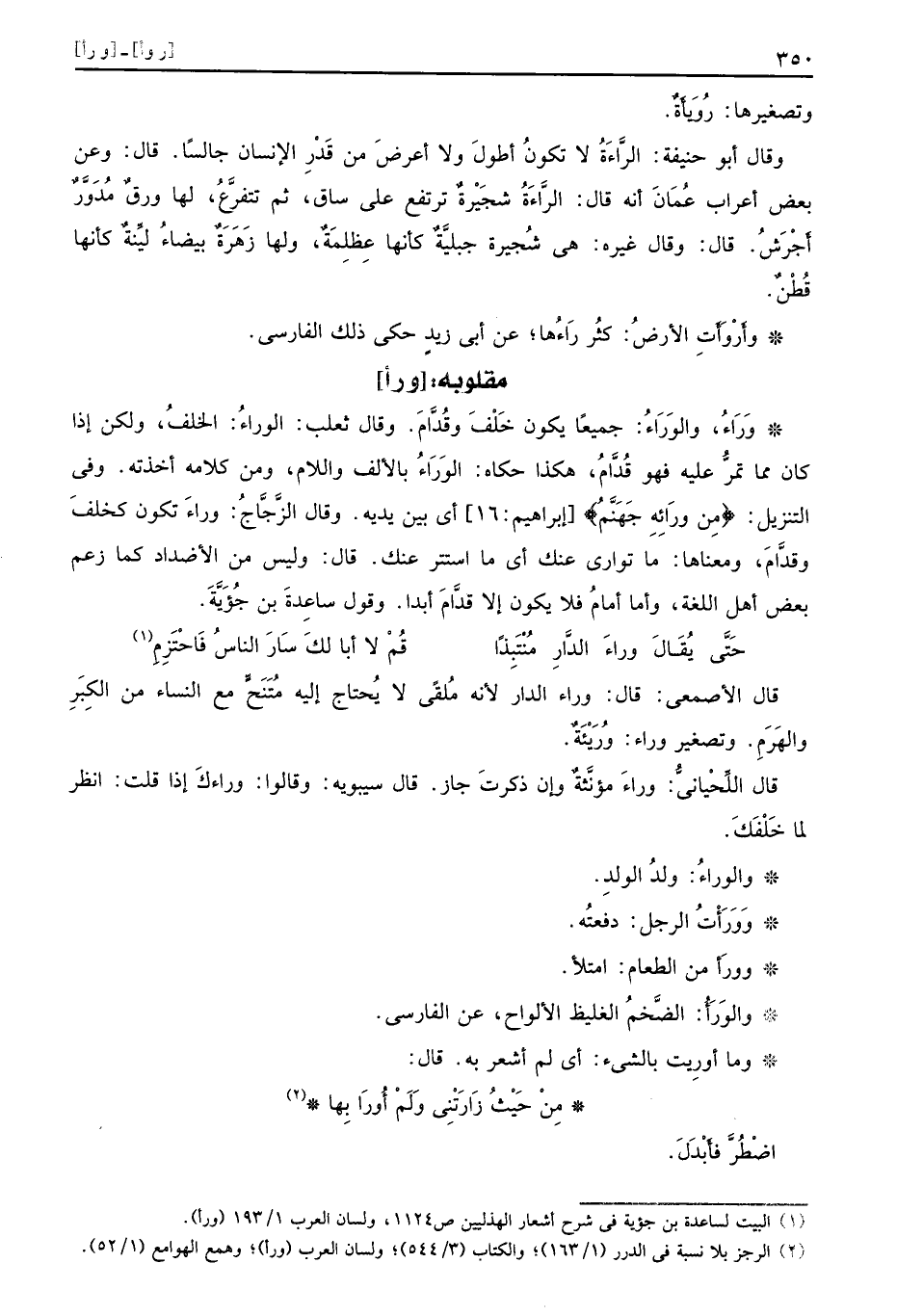 [ور أ] وَرَاءُ والوَرَاءُ جميعًا يكون خَلْفَ وقُدَّامَ وقال ثعلب الوراءُ الخلفُ ولكن إذا كان مما تمرُّ فهو قُدَّامُ هكذا حكاه الوَرَاءُ بالألف واللام ومن كلامه أخذته وفي التنزيل {من ورائه جهنم} إبراهيم 16 أي بين يديه وقال الزَّجَّاجُ وراءَ تكون كخلفَ وقدَّامَ ومعناها ما توارى عنك أي ما استتر عنك قال وليس من الأضداد كما زعم بعض أهل اللغة وأما أمامُ فلا يكون إلا قدَّامَ أبدا وقول ساعِدةَ بن جُؤَيَّةَ