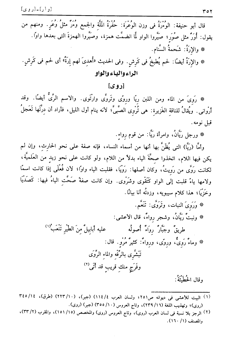 [ر وي] رَوِيَ من الماء ومن اللبن رِيّا ورِوًى وتَروَّى وارْتَوى والاسم الرِّيُّ أيضًا وقد أَرْواني ويُقالُ للناقةِ الغَزيرةِ هي تُرْوِي الصَّبيَّ لأنه ينام أول الليل فأراد أن دِرَّتَها تَعَجلُ قبل نومه ورجل رَيَّانُ وامرأة رَيَّا من قوم رِواءٍ وأمَّا رَيَّا التي يُظَنَّ بها أنها من أسماء النساء فإنه صفة على نحو الحارِثِ وإن لم يكن فيها اللام اتخذوا صِحَّةَ الياء بدلاً من اللام ولو كانت على نحو زيدٍ من العَلميَّة لكانت رَوَّى من رَوِيتُ وكان أصلها رَوْيَا فقلبت الياء واوًا لأن فُعْلَى إذا كانت اسمًا ولامها ياءً قلبت إلى الواو كتَقَوْى وشَرْوى وإن كانت صفةً صَحَّتِ الياءُ فيها كَصَدْيَا وخَزْيَا هذا كلام سيبويه وزدتُه أنا بيانًا وَرَوِيَ النبات وتَرَوَّى تَنَعَّم ونبتٌ رَيَّانُ وشجر رِواءٌ قال الأعشى