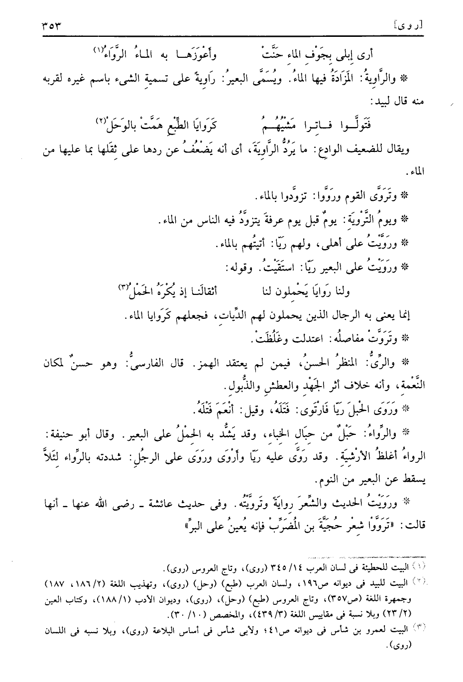 إنما يعني به الرجال الذين يحملون لهم الدِّياتِ فجعلهم كَرَوايا الماء وتَرَوَّتْ مفاصلُه اعتدلت وغَلُظَتْ والرِّيُّ المنظرُ الحسنُ فيمن لم يعتقد الهمز قال الفارسيُّ وهو حسنٌ لمكان النَّعْمةِ وأنه خلاف أثر الجَهْدِ والعطشِ والذُّبولِ وَرَوَى الْحبلَ رَيّا فَارْتَوى فَتَلَهُ وقيل أنْعَمَ فَتْلَهُ والرِّواءُ حَبْلٌ من حِبَالِ الخِباءِ وقد يَشُّد به الحِمْلُ على البعير وقال أبو حنيفة الرواءُ أغلظُ الأرْشِيَةِ وقد رَوَّى عليه رَيّا وأَرْوَى ورَوَى على الرجُلِ شددته بالرِّواءِ لِئَلاَّ يسقط عن البعير من النوم ورَوَيْتُ الحديث والشِّعرَ رِوايَةً وتَروَّيْتُه وفي حديث عائشة رضي الله عنها أنها قالت تَرَوَّوْا شِعْر حُجَيَّةَ بن المُضَرِّبْ فإنه يُعينُ على البرِّ