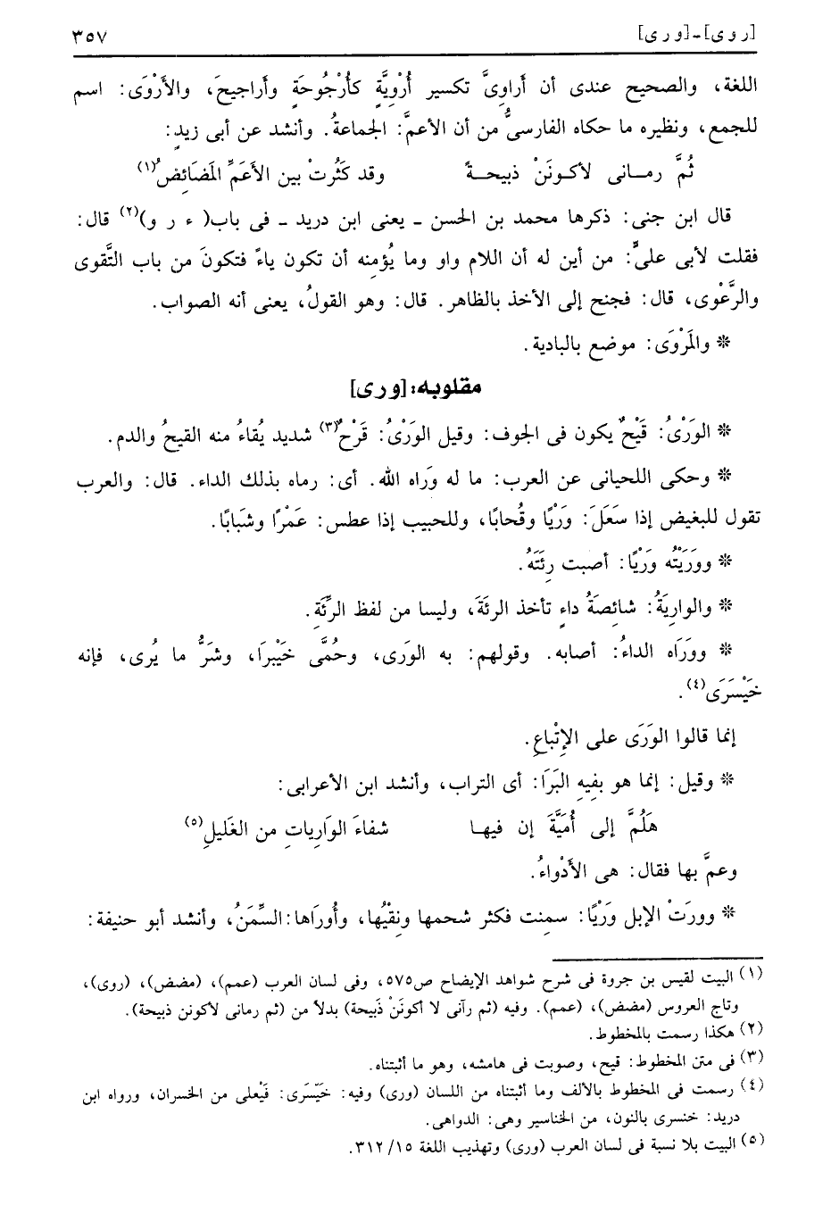 اللغة والصحيح عندي أن أَراوِيَّ تكسير أُرْوِيَّةٍ كأُرْجُوحَةٍ وأَراجيحَ والأَرْوَى اسم للجمع ونظيره ما حكاه الفارسيُّ من أن الأعمَّ الجماعةُ وأنشد عن أبي زيد