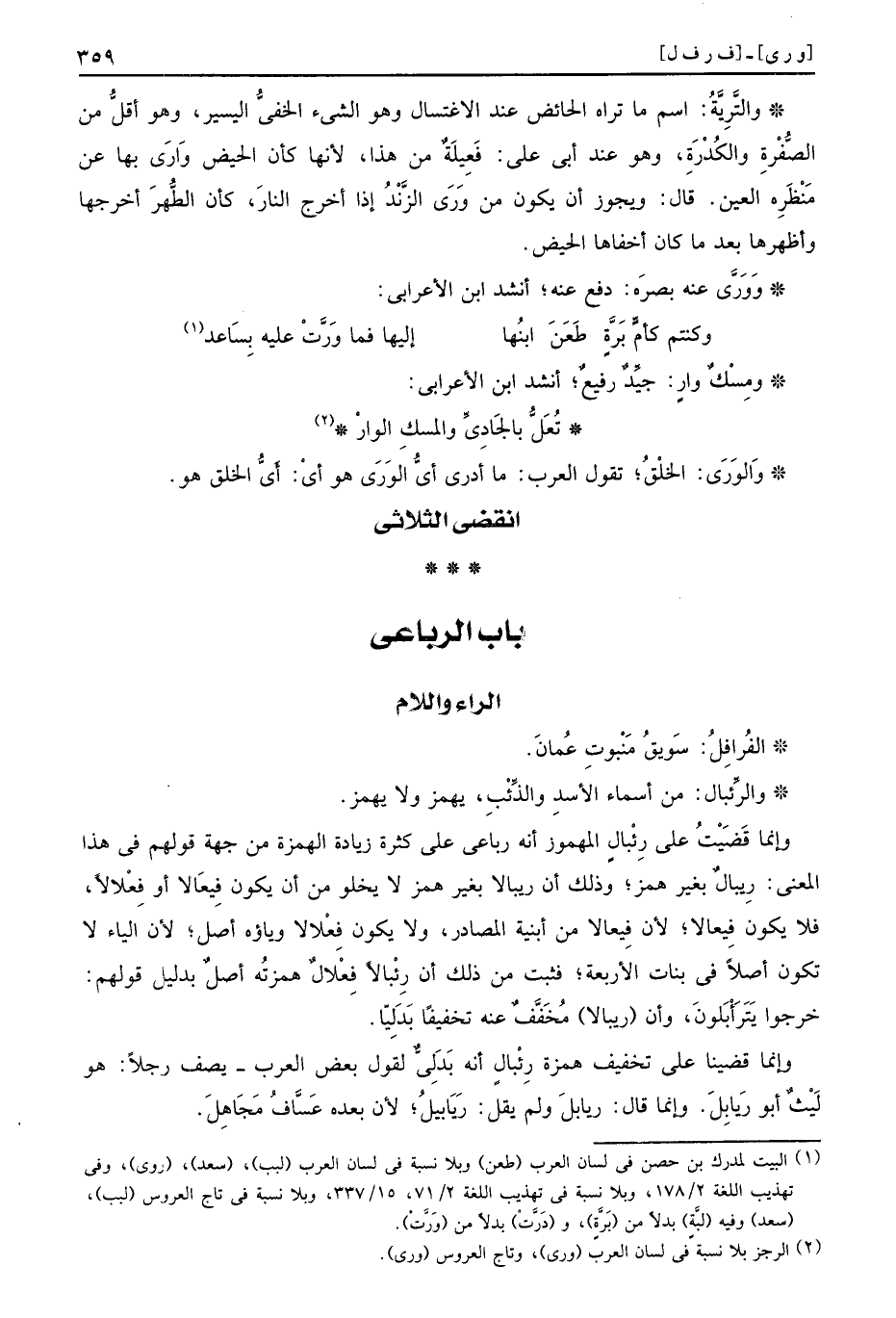 الفُرافِلُ سَويقُ مَنْبوتِ عُمانَ والرِّئبال من أسماء الأسدِ والذِّئْبِ يهمز ولا يهمز وإنما قَضَيْتُ على رِئْبالٍ المهموز أنه رباعي على كثرة زيادة الهمزة من جهة قولهم في هذا المعنى رِيبالٌ بغير همز وذلك أن ريبالا بغير همز لا يخلو من أن يكون فِيعَالا أو فِعْلالاً فلا يكون فِيعالا لأن فِيعالا من أبنية المصادر ولا يكون فِعْلالا وياؤه أصل لأن الياء لا تكون أصلاً في بنات الأربعة فثبت من ذلك أن رِئْبالاً فِعْلالٌ همزتُه أصلٌ بدليل قولهم خرجوا يَتَرَأْبَلونَ وأن ريبالا مُخَفَّفٌ عنه تخفيفًا بَدَلِيّا وإنما قضينا على تخفيف همزة رِئْبالٍ أنه بَدَلِيٌّ لقول بعض العرب يصف رجلاً هو لَيْثٌ أبو رَيابِلَ وإنما قال ريابلَ ولم يقل رَيَابيلُ لأن بعده عَسَّافُ مَجَاهِلَ
