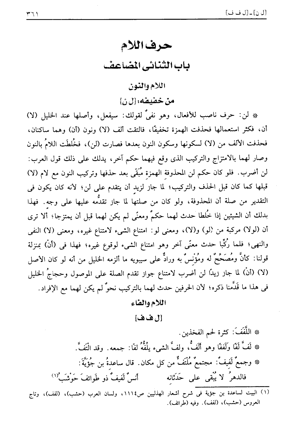 [ل ن] لن حرف ناصب للأفعال وهو نفيٌ لقولك سيفعل وأصلها عند الخليل لا أن فكثر استعمالها فحذفت الهمزة تخفيفًا فالتقت ألف لا ونون أن وهما ساكنان فحذفت الألف من لا لسكونها وسكون النون بعدها فصارت لن فخُلطَت اللامُ بالنون وصار لهما بالامتزاج والتركيب الذي وقع فيهما حكم آخر يدلك على ذلك قول العرب لن أضرب فلو كان حكم لن المحذوفةِ الهمزةِ مُبَقّى بعد حذفها وتركيب النون مع لام لا قبلها كما كان قبل الحذف والتركيب لما جاز لزيدٍ أن يتقدم على لن لأنه كان يكون في التقدير من صلة أن المحذوفة ولو كان من صلتها لما جاز تقدُّمه عليها على وجهٍ فهذا يدلك أن الشيئين إذا خُلطا حدث لهما حكمٌ ومعنًى لم يكن لهما قبل أن يتمزجا ألا ترى أن لولا مركبة من لو ولا ومعنى لو امتناع الشيء لامتناع غيره ومعنى لا النفي والنهي فلما رُكِّبا حدث معنًى آخر وهو امتناع الشيء لوقوع غيره فهذا في أَنْ بمنزلة قولنا كأنَّ ومُصَحِّحٌ له ومُؤْنِسٌ به ورادٌّ على سيبويه ما ألزمه الخليل من أنه لو كان الأصل لا أنْ لما جاز زيدًا لن أضرب لامتناع جواز تقدم الصلة على الموصول وحجاجُ الخليل في هذا ما قَدَّمنا ذكره لأن الحرفين حدث لهما بالتركيب نحوٌ لم يكن لهما مع الإفراد