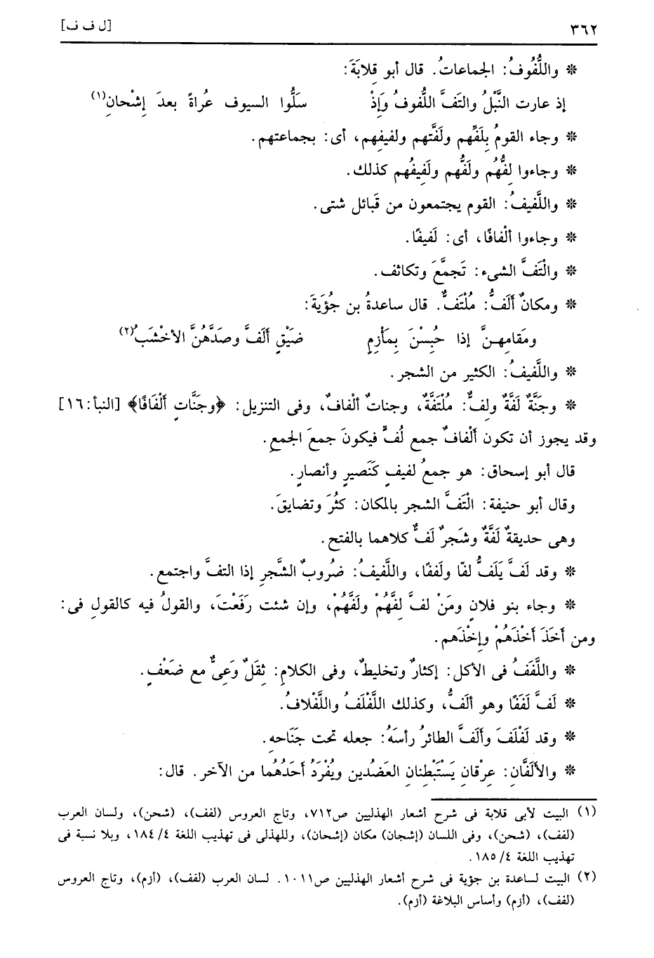 وجاء القومُ بِلَفِّهم ولَفَّتهم ولفيفِهم أي بجماعتهم وجاءوا لِفُّهُم ولَفِهم كذلك واللَّفيفُ القوم يجتمعون من قَبائل شتى وجاءوا ألْفافًا أي لَفيفًا والْتَفَّ الشيء تَجمَّعَ وتكاثف ومكانٌ أَلَفُّ مُلْتَفٌّ قال ساعدةُ بن جُؤَيةَ